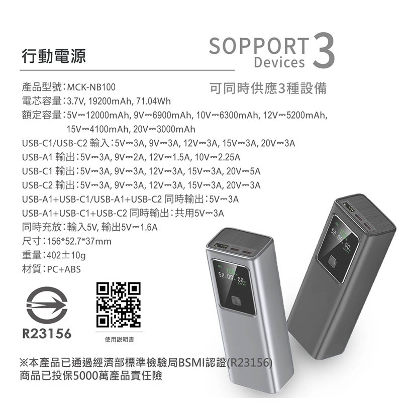 MCK 台灣製造 19200mAh 100W數顯快充行動電源(數顯電壓、電流、瓦數)
