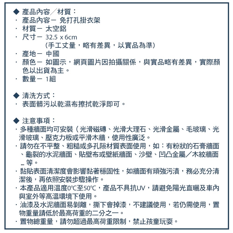 ◆ 油漆及水泥牆面易剝離,撕下會掉漆,不建議使用,若仍需使用,置物重量請低於最高荷重的二分之一。