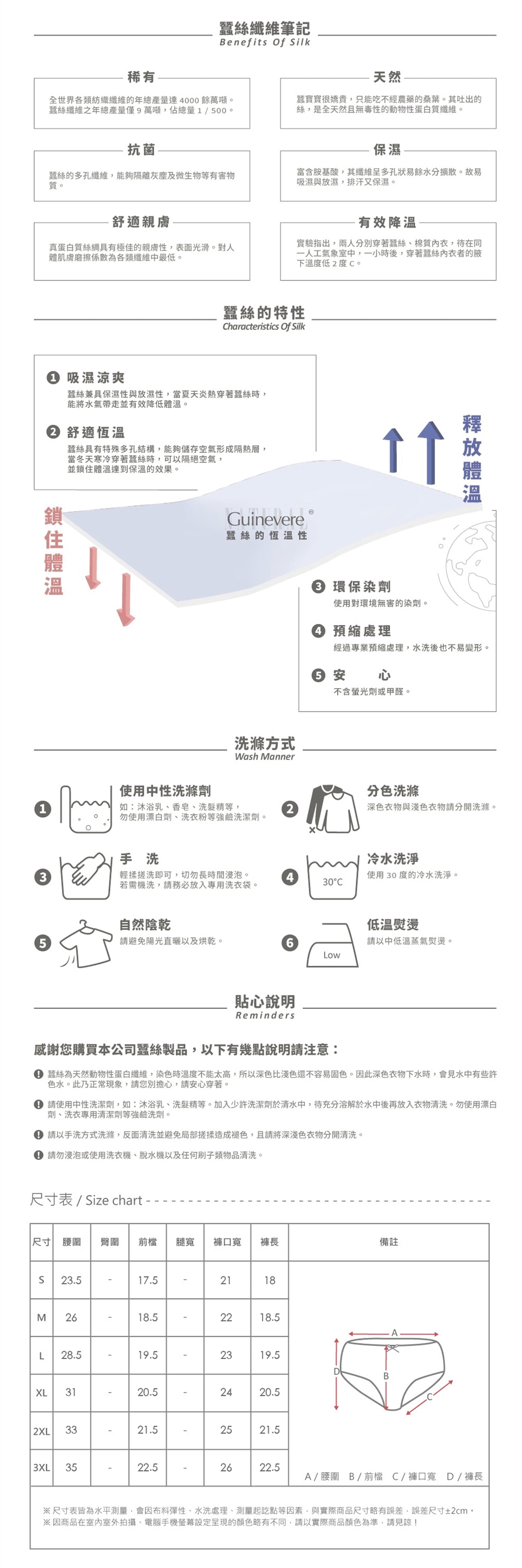 ※洗滌方式: 可水洗,請用40度以下冷水清洗,深淺顏色衣物請分開洗滌。請使用中性洗劑 (如:蠶絲專用洗潔液、沐浴乳、洗髮精),切勿使用漂白水、洗衣粉、冷洗精等強鹼洗劑。請於陰涼處晾乾即可,避免陽光曝曬。