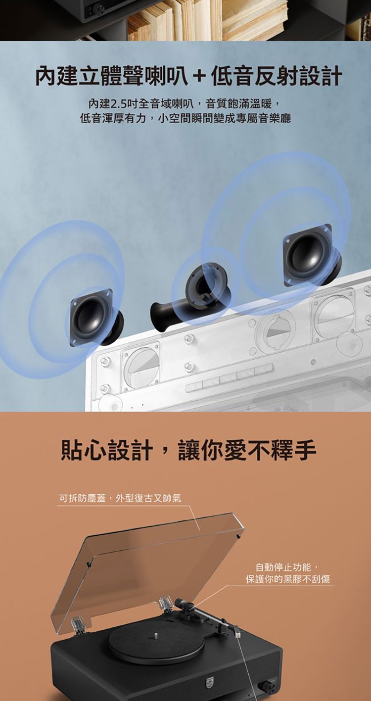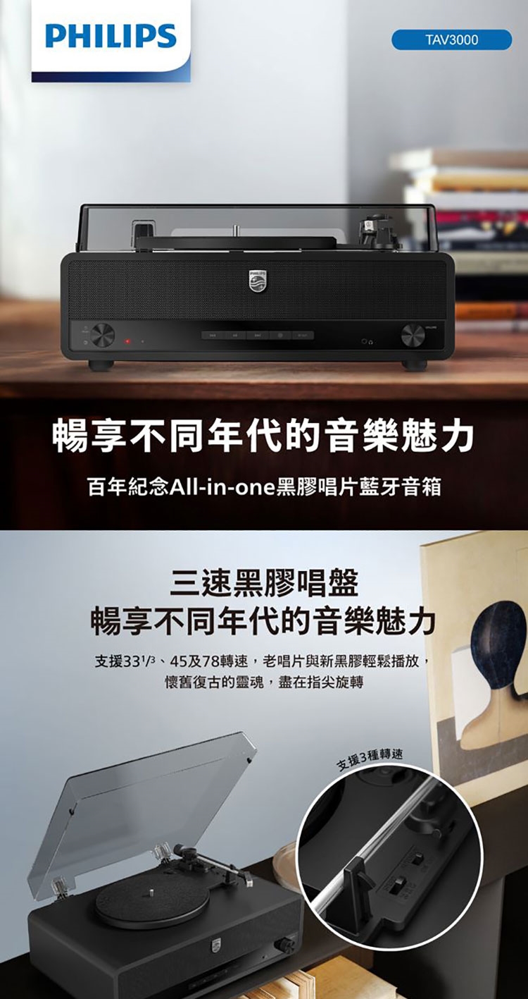 ◆ 三速黑膠唱盤支援331/3、45及78轉速,老唱片與新黑膠輕鬆播放