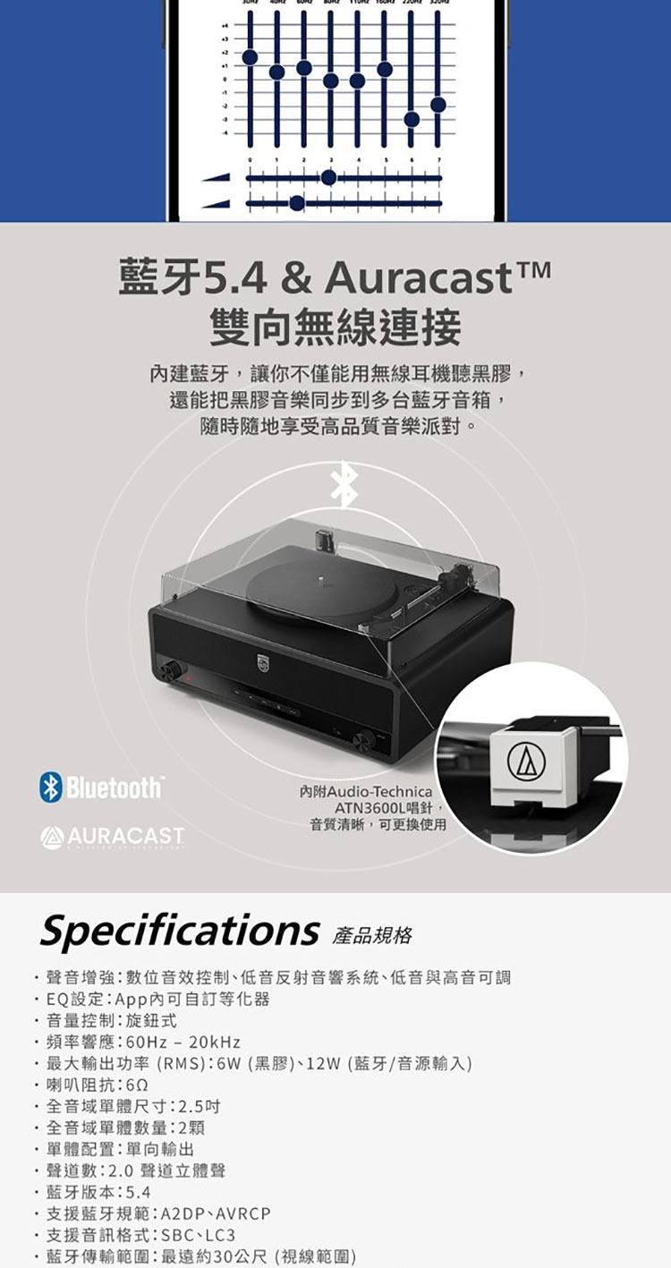 ◎ 最大輸出功率 (RMS):6W (黑膠)、12W (藍牙/音源輸入)