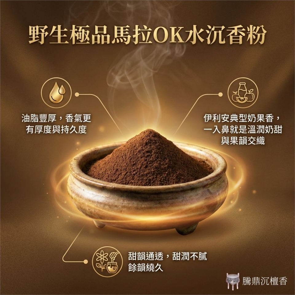 這款「野生極品馬拉OK水沉香粉」,油脂表現更飽滿、香韻更立體,但又保留日常也能輕鬆品玩的順口度。嚴選印尼星洲系原料,經大量收購後細緻分級,粉體色澤深邃、油脂感明顯,香氣擴散力強,層次一路推進,細膩耐品。