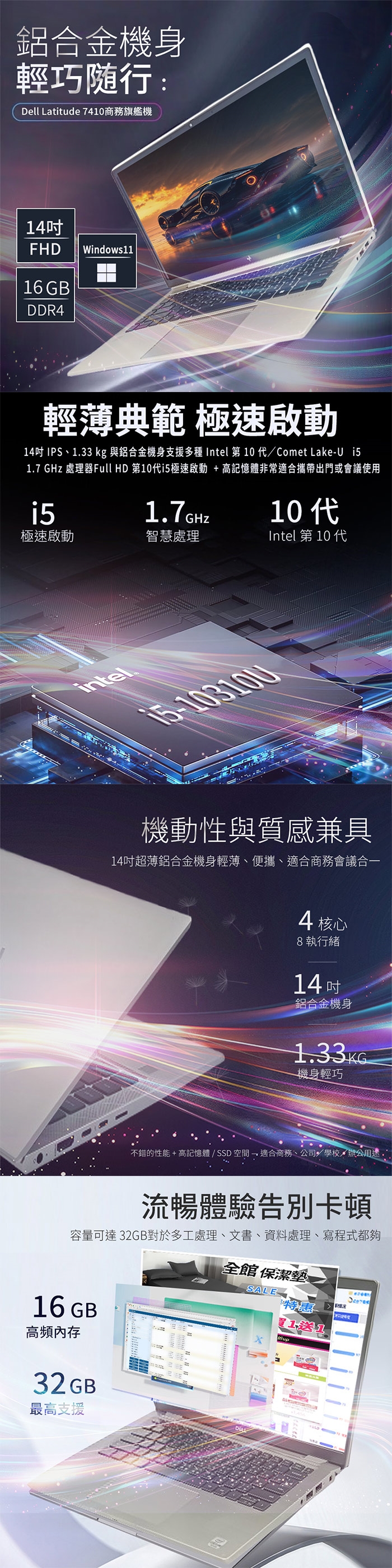 散熱提醒: Latitude 7410 採用窄邊框設計,散熱孔位於轉軸與底部,使用時請避免放在床墊等軟質物體上,以維持 i5 處理器的流暢度。