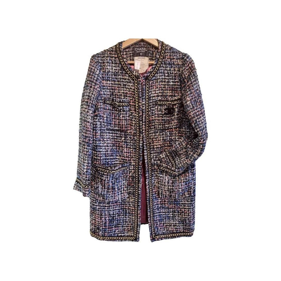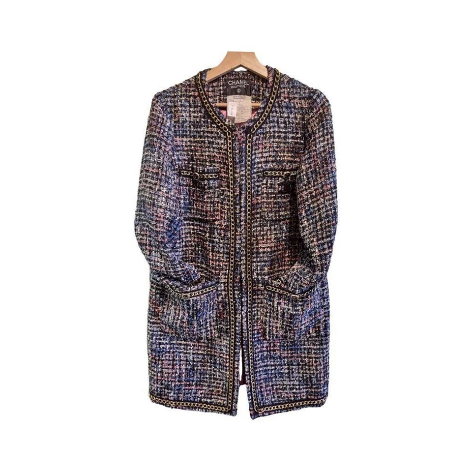 CHANEL 香奈兒粗花呢長版大衣,以品牌經典粗花呢(Bouclé)面料打造,呈現法式高級時尚的極致質感。選用立體紋理豐富的高級粗花呢材質,柔軟舒適且挺度適中,兼具保暖與造型感。大衣版型修長俐落,經典設計與精緻細節完美融合,展現香奈兒優雅、時尚且具有辨識度的精品風格。