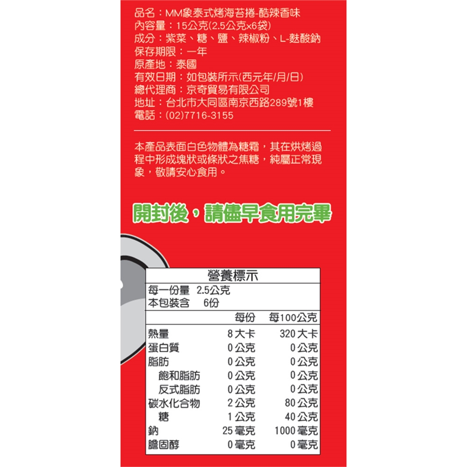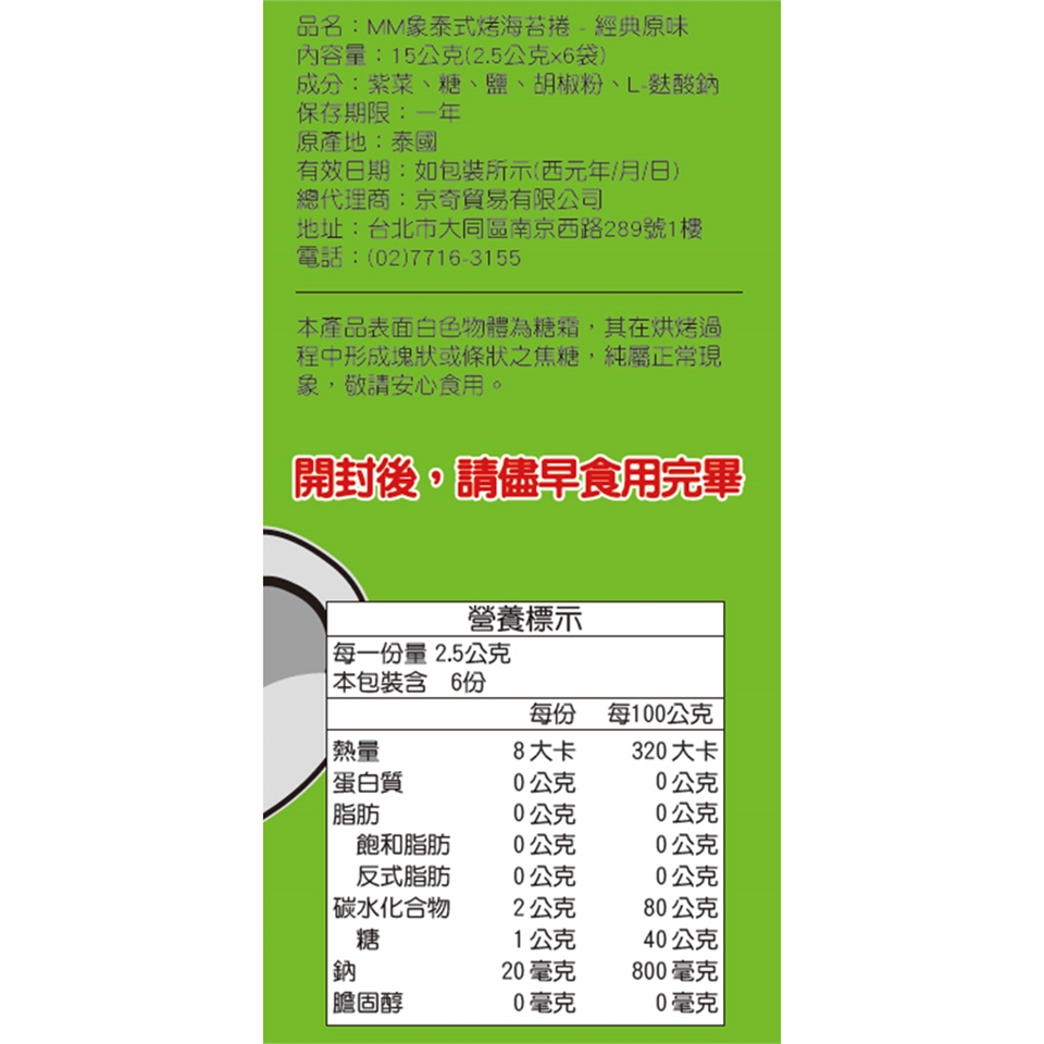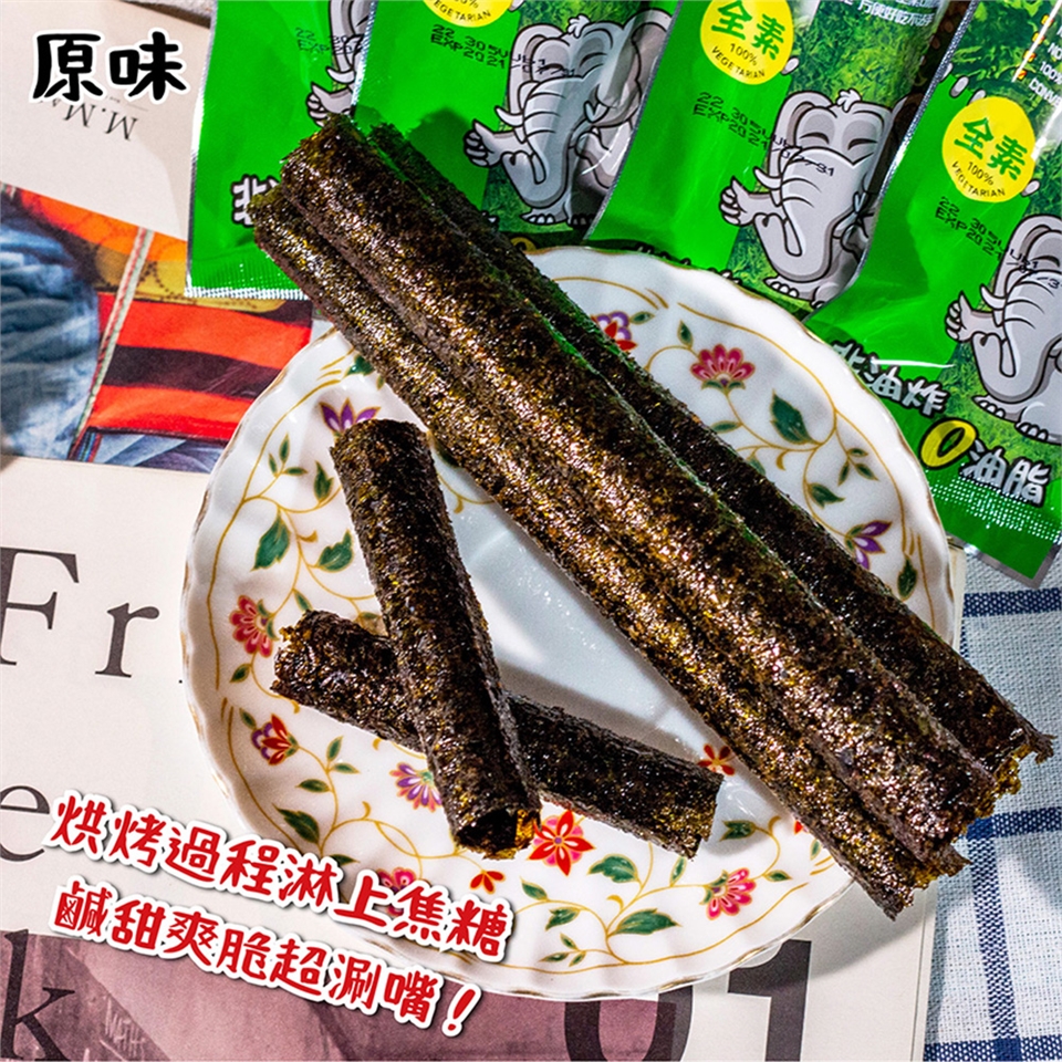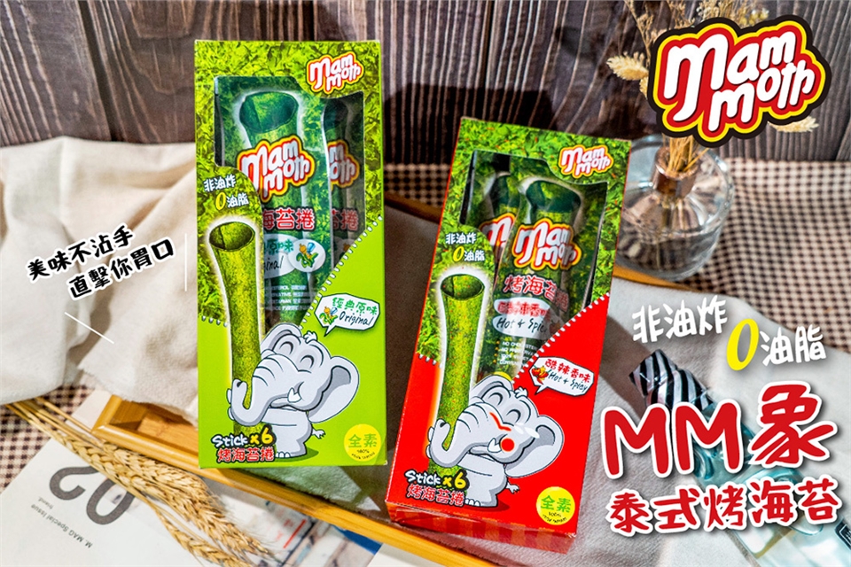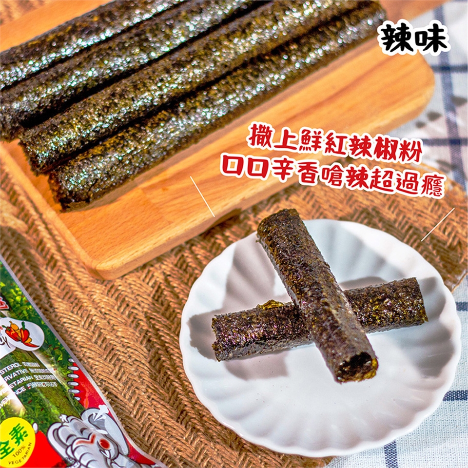 • 以傳統泰式烘烤法手工製成,將爽脆海苔捲成適口大小,口感厚實酥脆,美味不沾手。