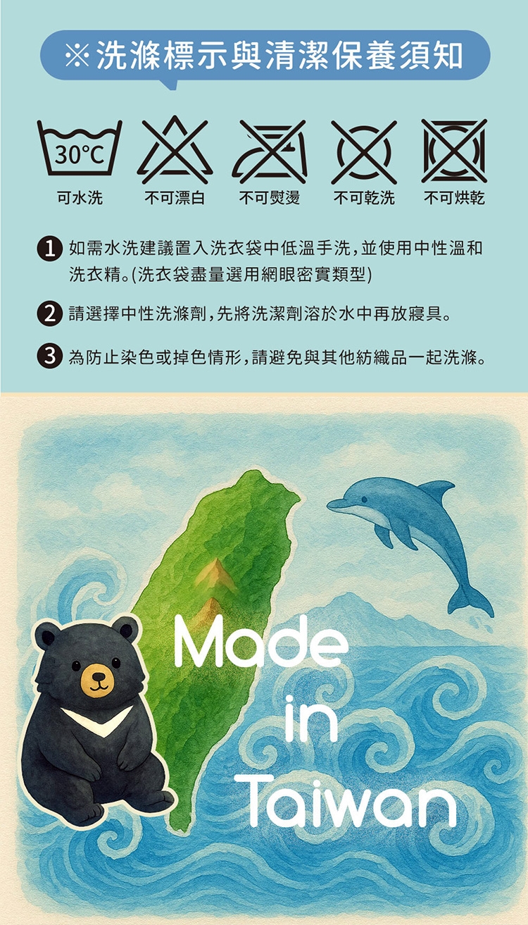 ※如需水洗建議置入洗衣袋中使用低溫手洗,並使用中性溫和洗衣精。(洗衣袋盡量選用網眼密實類型)
