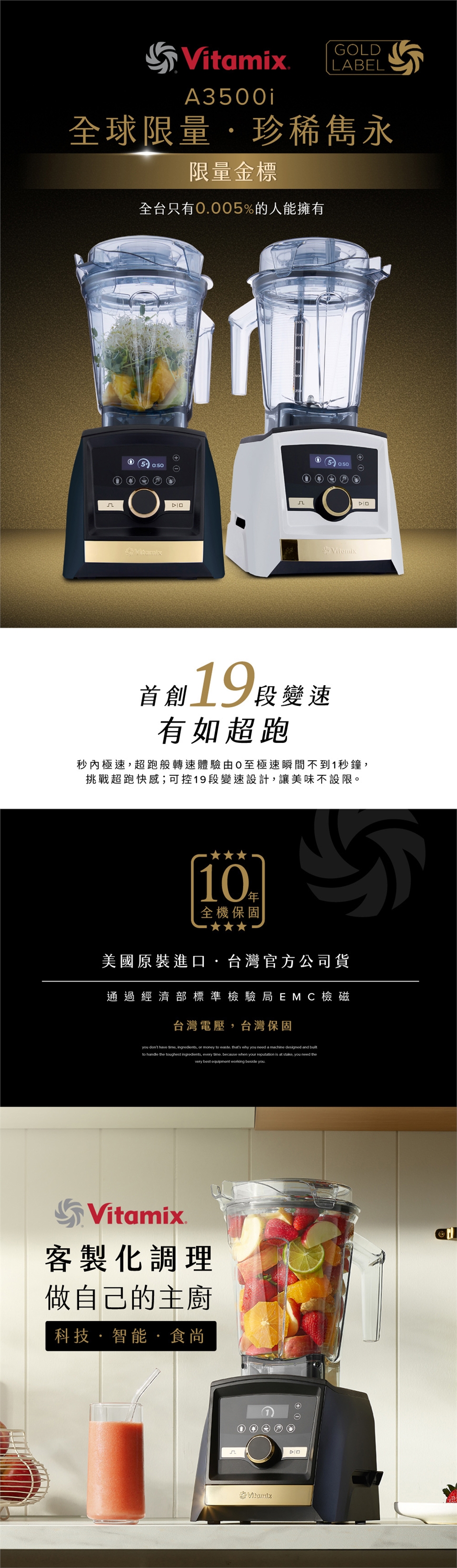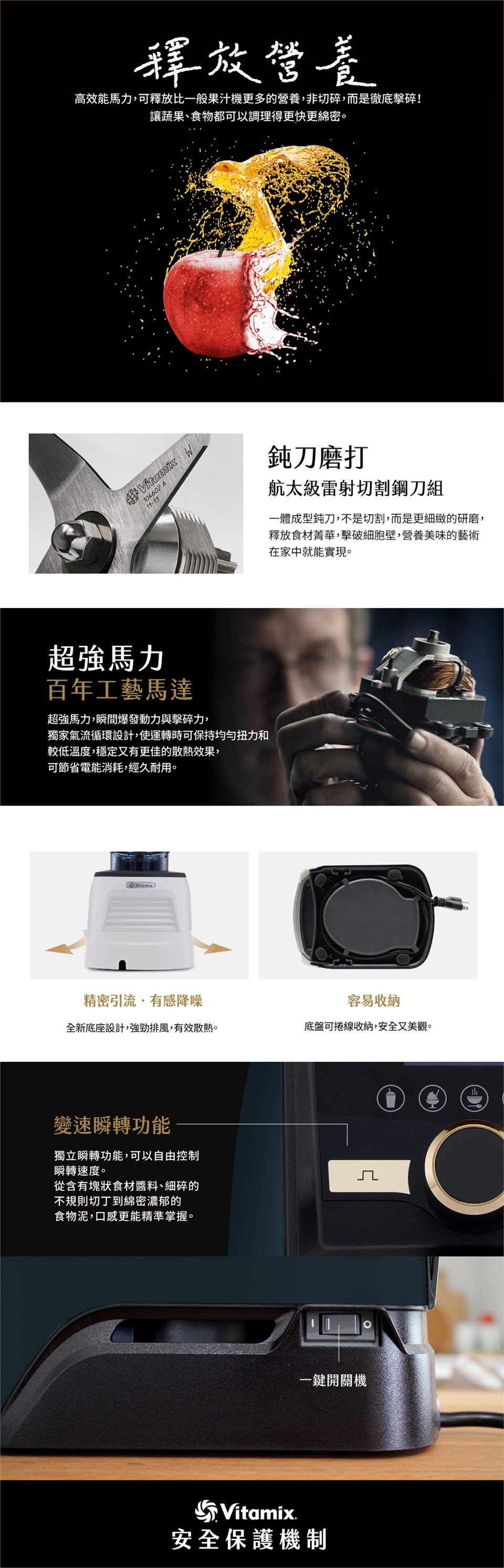 首創業界最高19段變速,有如超跑,果昔、冰品1分鐘內即可調理完成!配備2L低寬型全透明Tritan食品級無雙酚A容杯,食材攪打360度可視角度,全程不藏私!全機10年保固,耐用程度超乎您的想像!