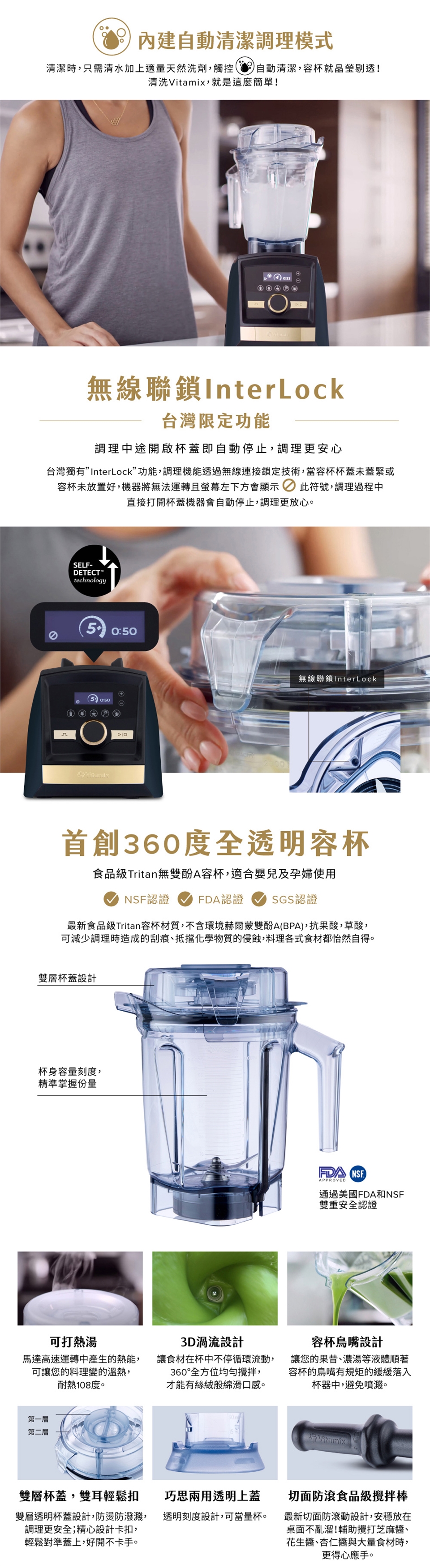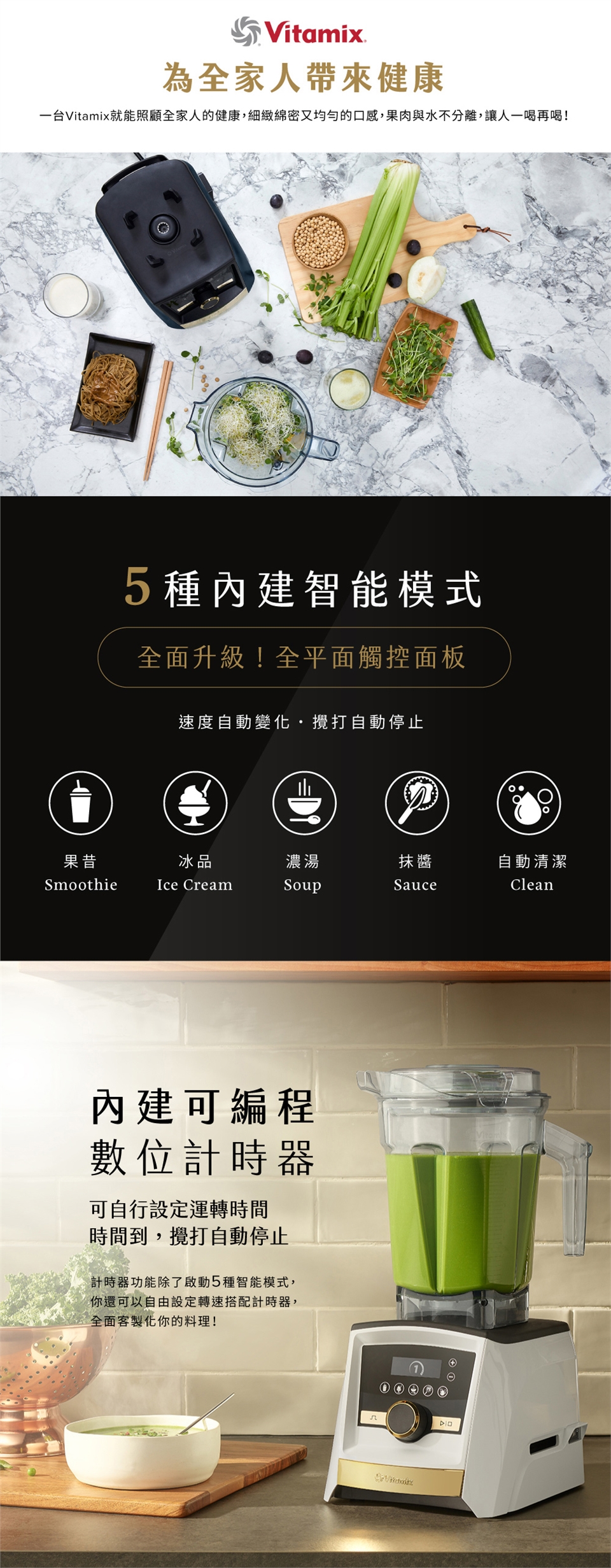 Vitamix延續經典全面升級!完美結合新科技!觸控式面板新體驗,保留經典旋鈕變速操作,增設5項智能調理程式─果昔、冰品、濃湯、抹醬、自動清潔,程式啟動自動計時調理,攪打完成自動停止,您還可以自行設定速度搭配攪打時間,美味料理自由變化,分分秒秒由你掌握。