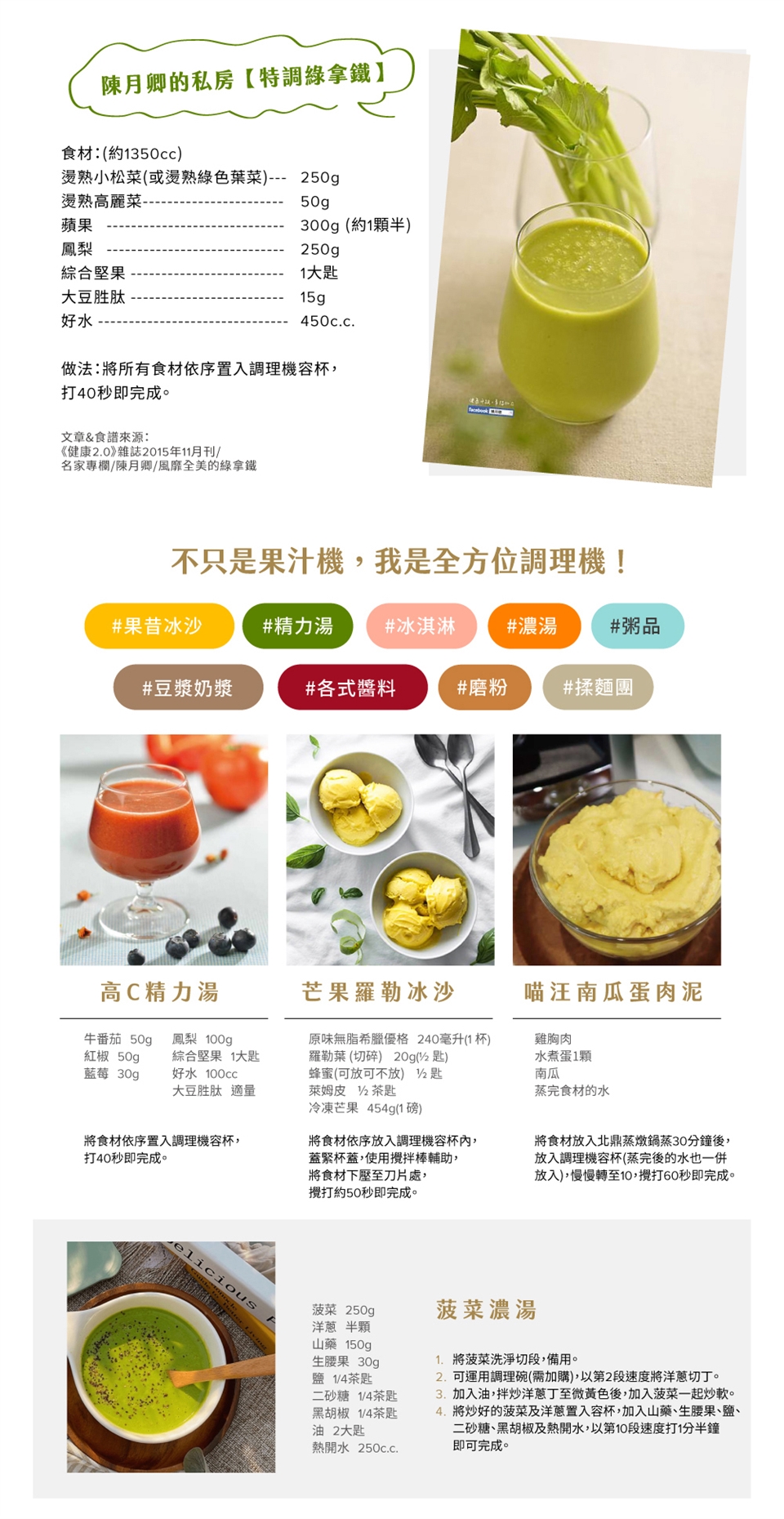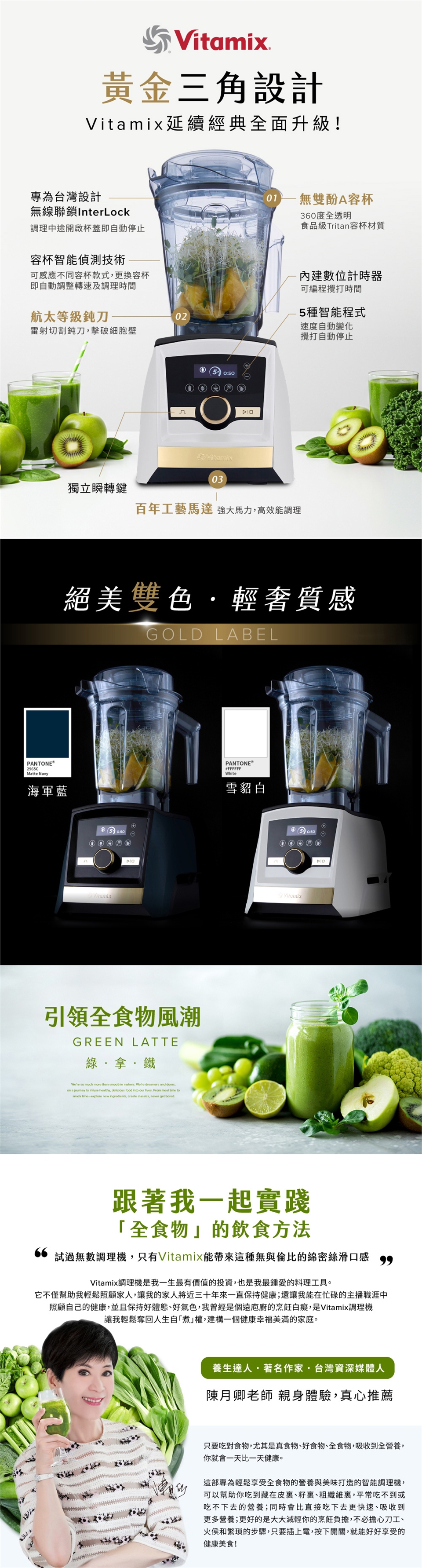知名主持人、暢銷作家、養生達人─陳月卿老師,唯一指定用調理機!親身體驗,誠心推薦。Vitamix調理機的「黃金組合」能加倍釋放細胞壁中的脂質與植化素,減少微量元素氧化,釋放更多食材美味,試過無數調理機,只有Vitamix能帶來這種無與倫比的綿密絲滑口感,釋放最完整的營養素。