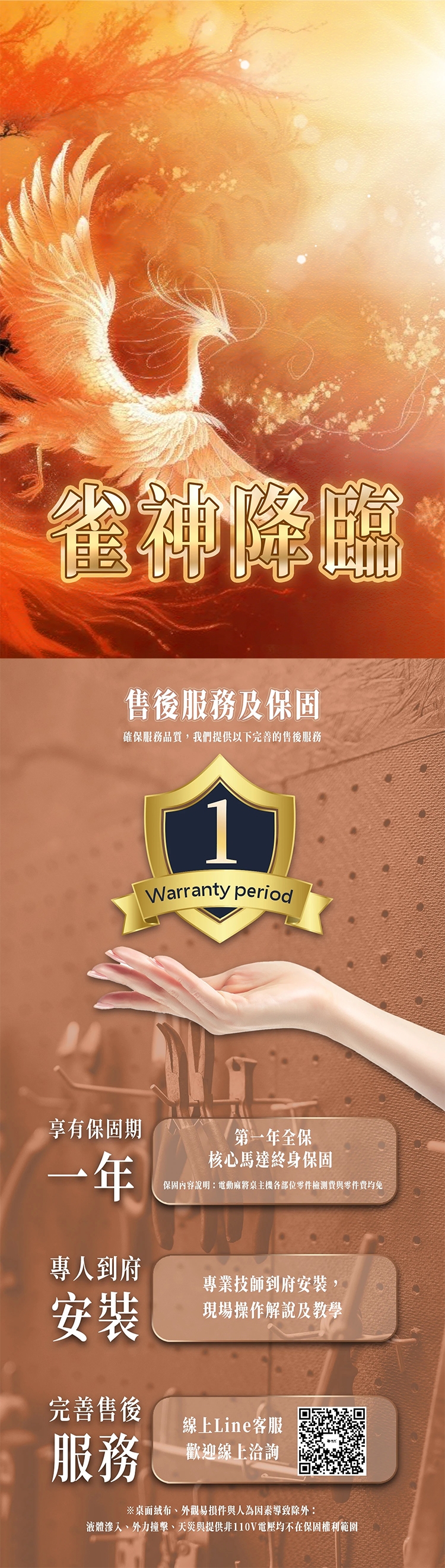 1.產品由雀神公司專業人員到府安裝、操作、保養教學。除花東、離島地區、偏遠地區(若可自行搬運例外)無法專人到府配送,其他縣市均到府配送。