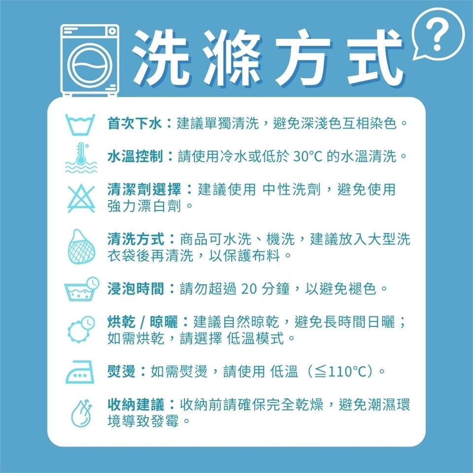 套洗衣袋單獨清洗/勿浸泡/冷水洗滌/勿烘乾/勿漂白/收納保持乾燥