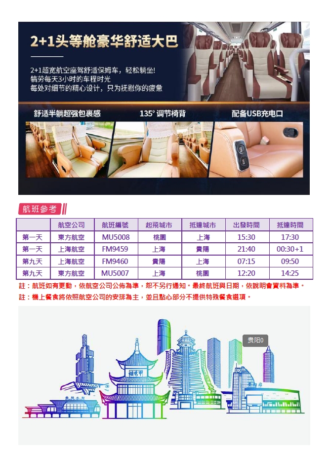 今日集合桃園國際機場,搭乘豪華班機,經上海轉機前往貴陽。 早餐:XXX |