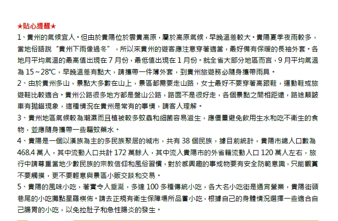 為了您在本次旅遊途中本身的安全,我們特別請您遵守下列事項,這是我們應盡告知的責任,也是保障您的權益。