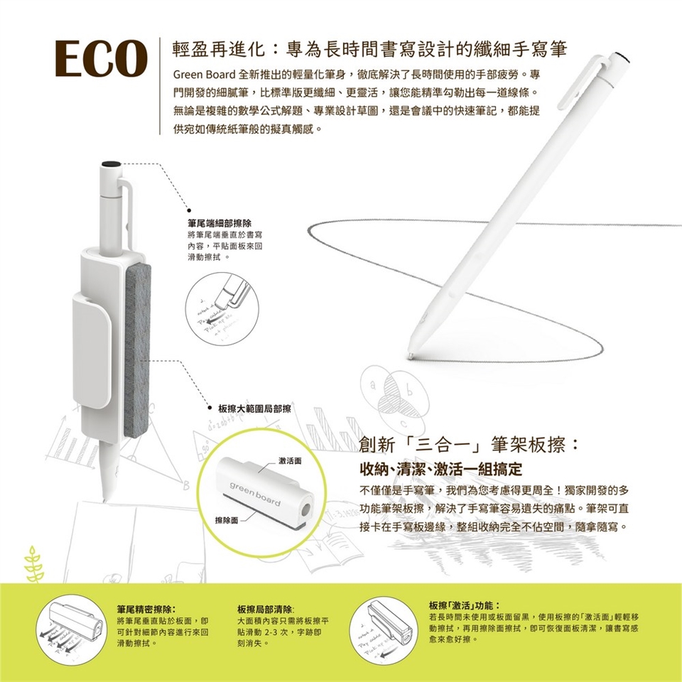 Green Board 全新推出的輕量化筆身,徹底解決了長時間使用的手部疲勞。專門開發的細膩筆,比標準版更纖細、更靈活,讓您能精準勾勒出每一道線條。無論是複雜的數學公式解題、專業設計草圖,還是會議中的快速筆記,都能提供宛如傳統紙筆般的擬真觸感。