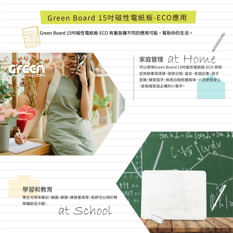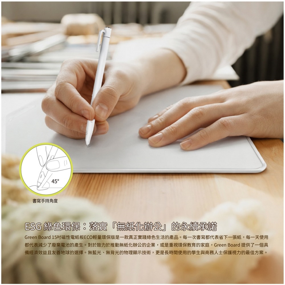 Green Board 15吋磁性電紙板ECO環保版是一款真正實踐綠色生活的產品。每一次書寫都代表省下一張紙,每一天使用都代表減少了廢棄電池的產生。對於致力於推動無紙化辦公的企業,或是重視環保教育的家庭,Green Board 提供了一個具備經濟效益且友善地球的選擇。無藍光、無背光的物理顯示技術,更是長時間使用的學生與商務人士保護視力的最佳方案。