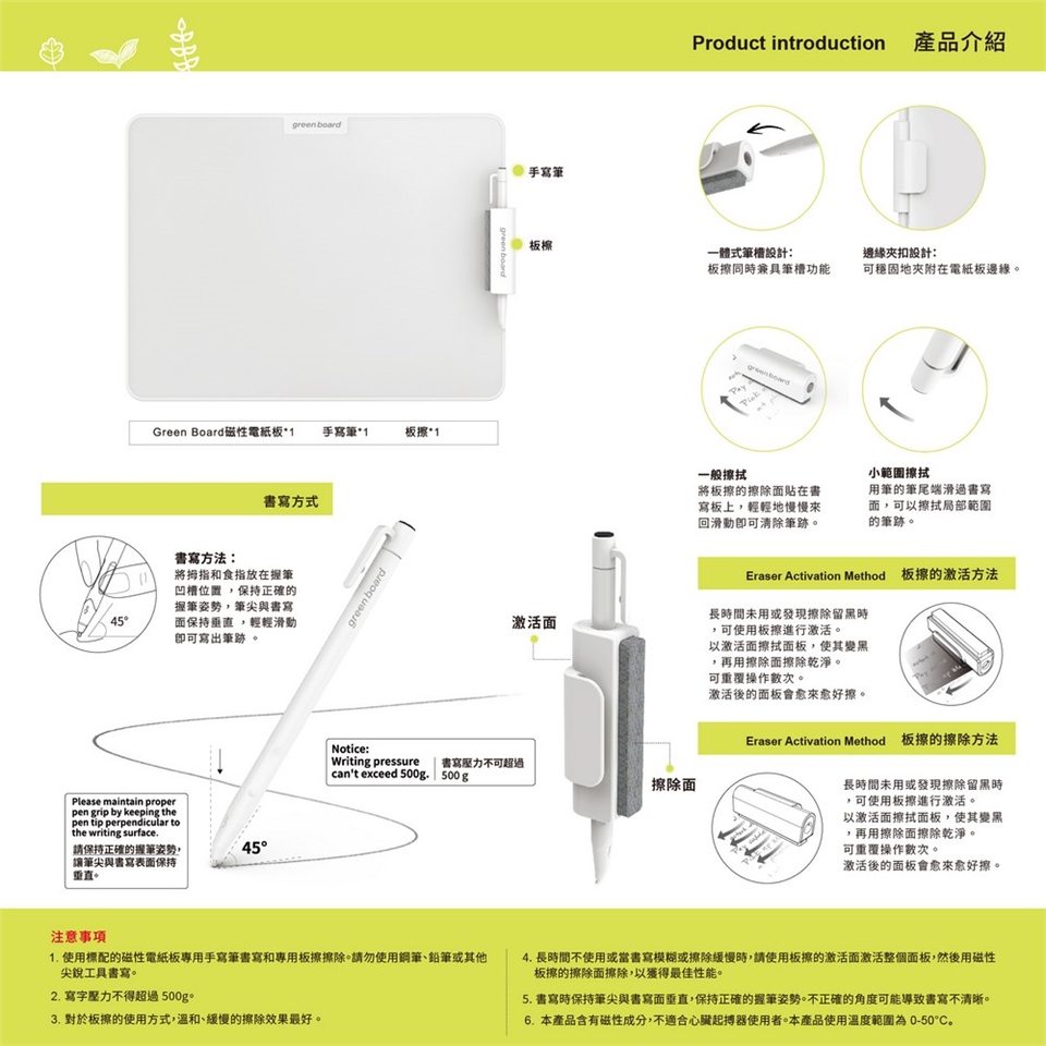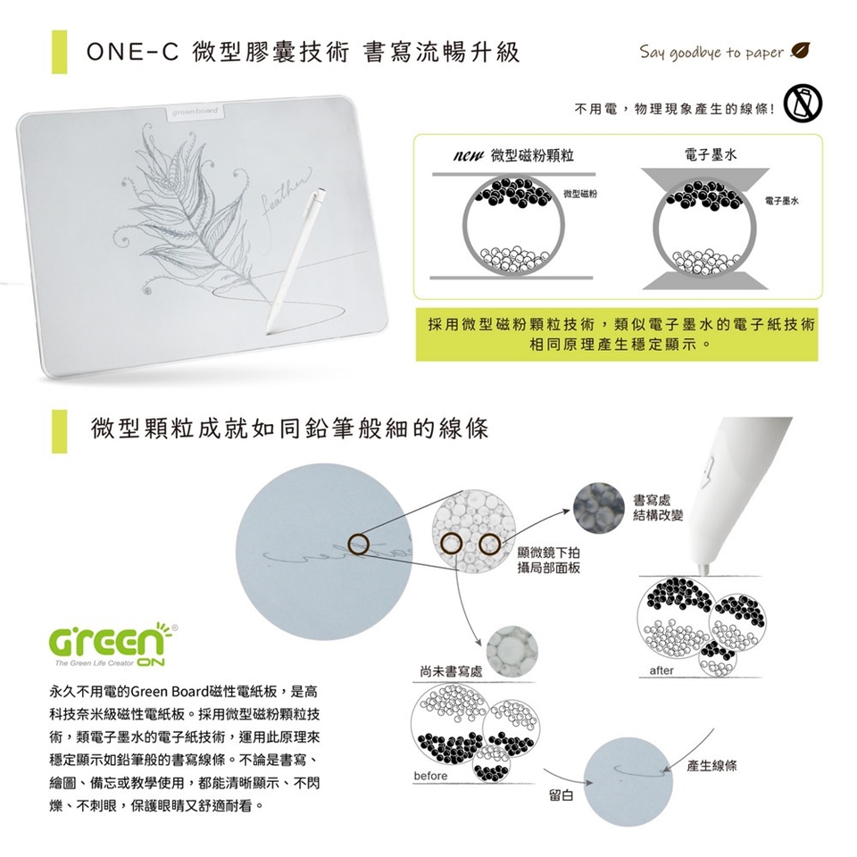永久不用電的Green Board磁性電紙板,是高科技奈米級磁性電紙板。採用微型磁粉顆粒技術,類電子墨水的電子紙技術,運用此原理來穩定顯示如鉛筆般的書寫線條。不論是書寫、繪圖、備忘或教學使用,都能清晰顯示、不閃爍、不刺眼,保護眼睛又舒適耐看。