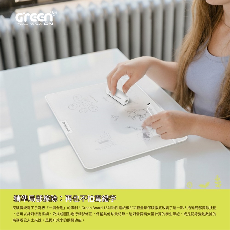 突破傳統電子手寫板「一鍵全刪」的限制!Green Board 15吋磁性電紙板ECO輕量版徹底改變了這一點!透過局部擦除技術,您可以針對特定字詞、公式或圖形進行細部修正,保留其他珍貴紀錄。這對需要精大量計算的學生筆記、或是記錄變動數據的商務辦公人士來說,是提升效率的關鍵功能。