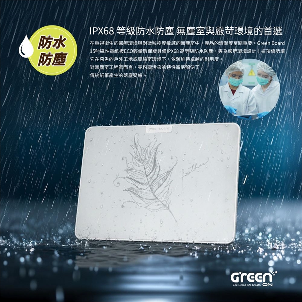 在重視衛生的醫療環境與對微粒極度敏感的無塵室中,產品的清潔度至關重要。Green Board 15吋磁性電紙板ECO版具備IPX68 高等級防水防塵,專為嚴苛環境設計!這項優勢讓它在惡劣的戶外工地或實驗室環境下,依舊維持卓越的耐用度。對無塵室工程師而言,零粉塵污染的特性徹底解決了傳統紙筆產生的落塵疑慮。