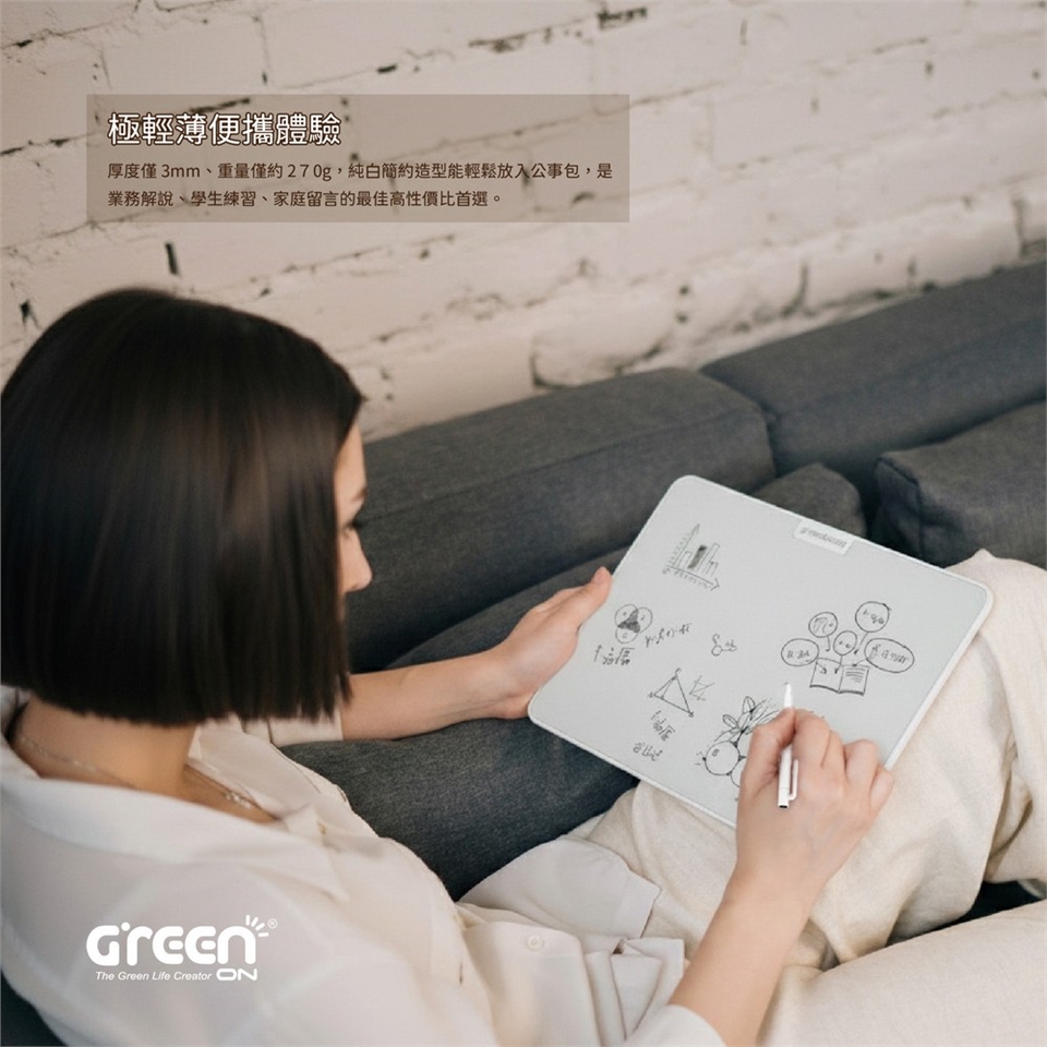 Green Board 15吋磁性電紙板厚度僅3mm、重量僅約270g,純白簡約造型能輕鬆放入公事包,是業務解說、學生練習、家庭留言的最佳高性價比首選。