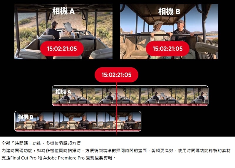 - 內建時間碼功能,助益實現多機位畫面剪輯同步。