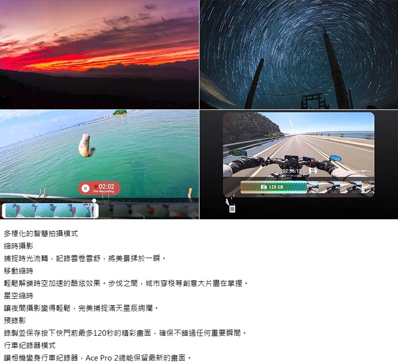 - 移動縮時、星空縮時、預錄影、行車紀錄器…等多樣智慧拍攝模式。