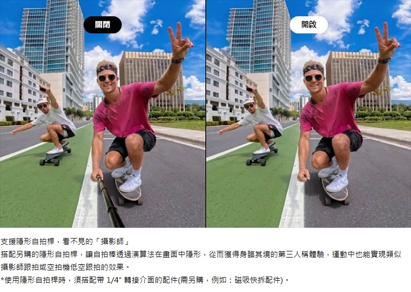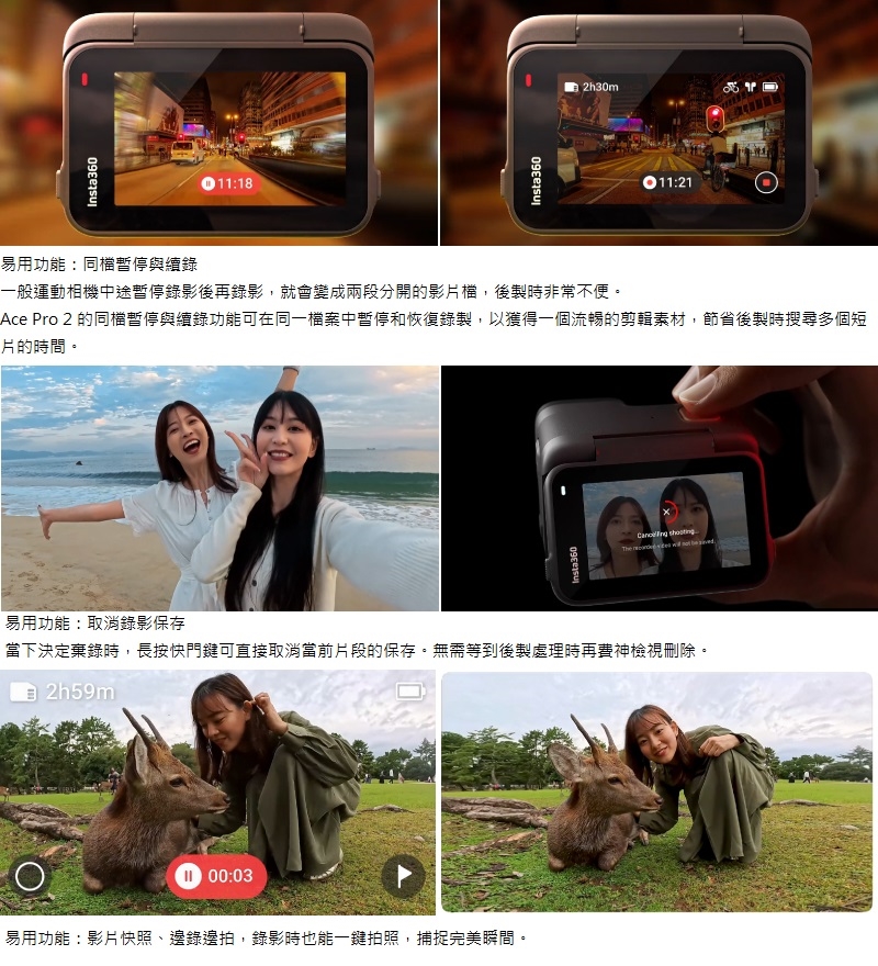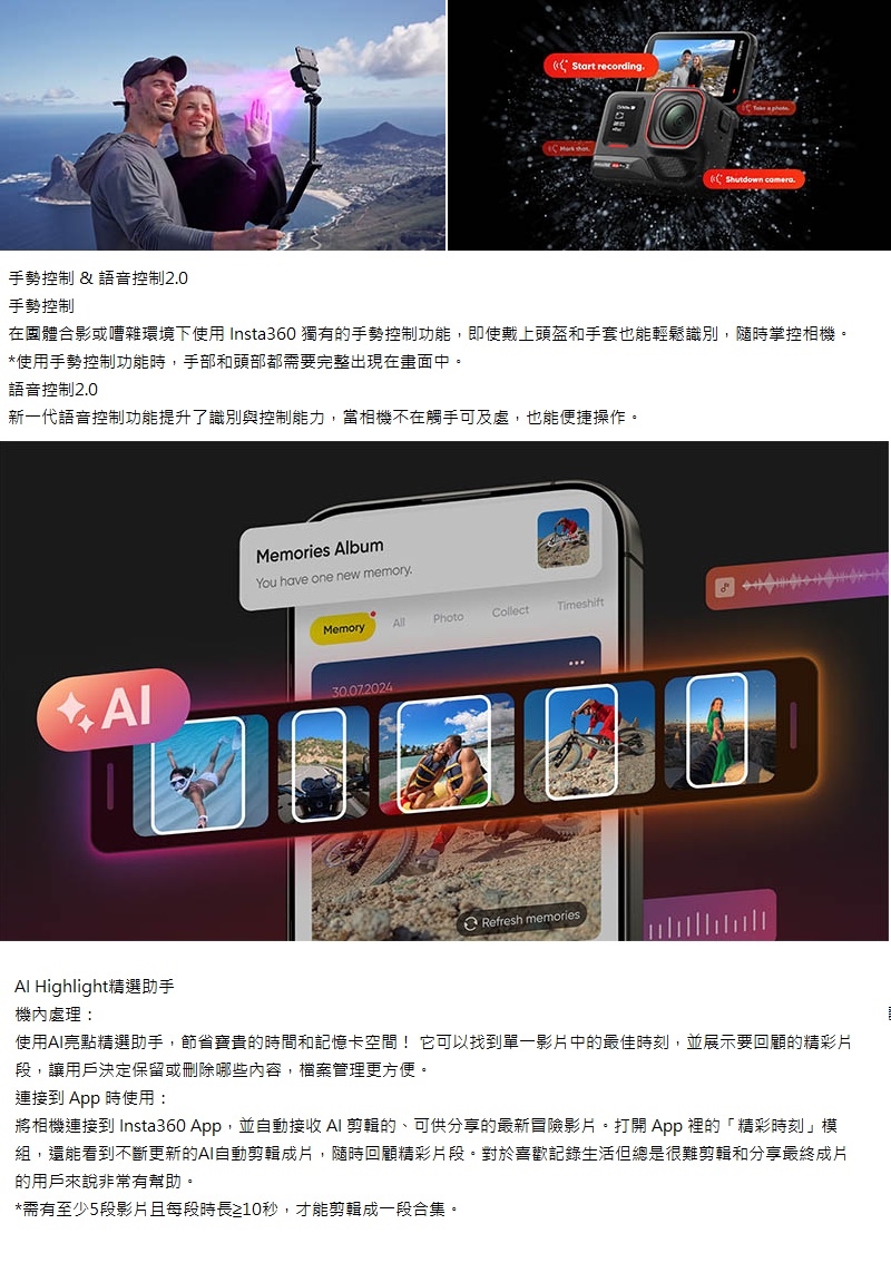 - 多種易用功能:4K無損變焦、邊錄邊拍、同檔暫停/續錄、手勢/語音控制、AI魔術師…等。