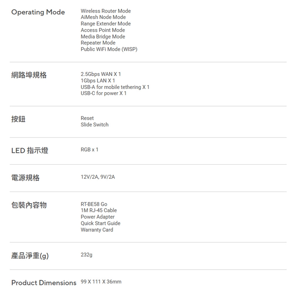 具備可攜式、工作和家用三模式連線,支援 4G/5G 行動網路分享和公共 WiFi 模式。