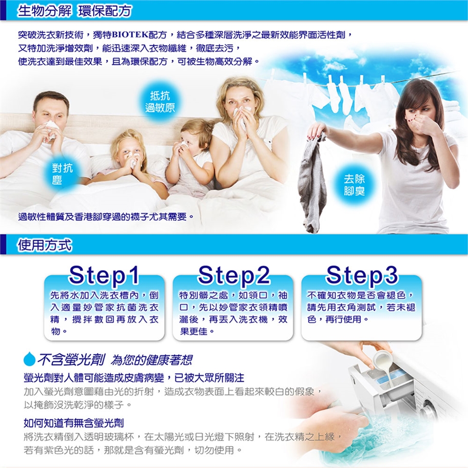 添加植物茶樹油抗菌劑,有效洗去衣物上的塵蟎,抑制黃金葡萄球菌,大腸桿菌等,讓衣物徹底乾淨。