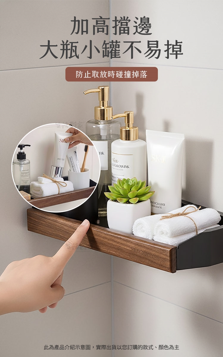 加高擋邊:有效防止拿取或放置物品時碰撞滑落,特別適合高瓶身的沐浴乳或洗髮精。