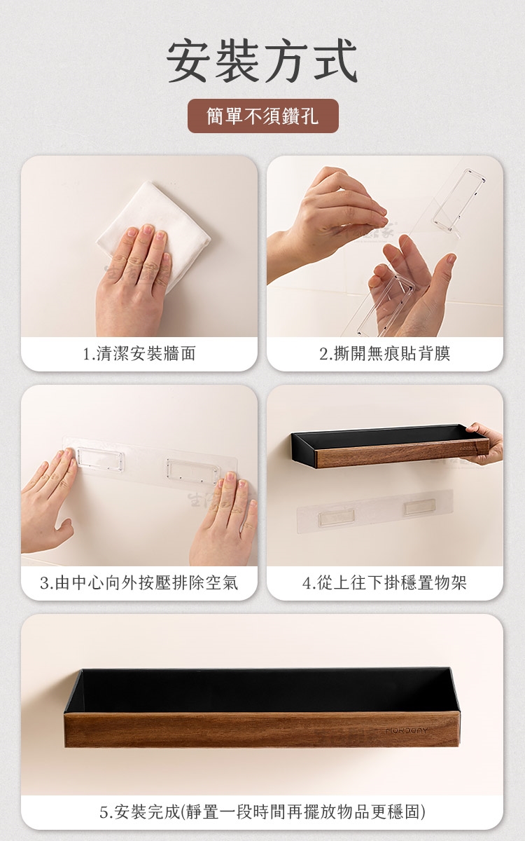 A1: 安裝非常簡單。採用 免打孔無痕貼 設計,不需鑽牆鑽孔或使用任何電動工具,只需清潔牆面、貼上無痕貼並排除空氣後,靜置12小時後將置物架掛上即可。