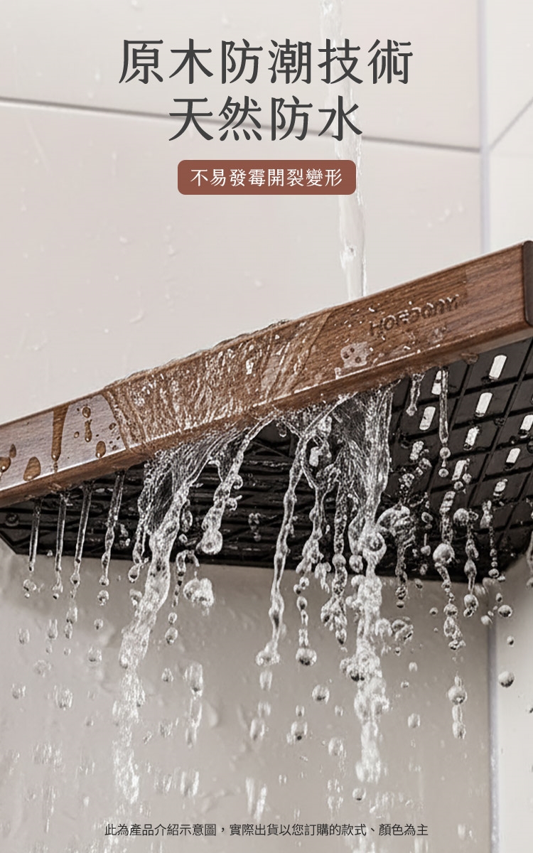 A2: 不會。本產品採用特殊 原木防潮技術 處理過的黑胡桃木,具有天然防水性,可抵抗浴室潮濕環境,不易發霉、開裂或變形。