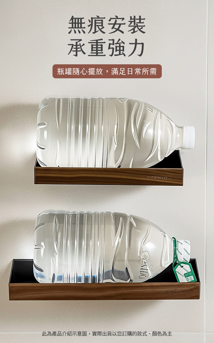 安裝後極度穩固,按壓不搖晃,承重力經測試可輕鬆放置多瓶大容量水瓶,滿足您日常所有收納需求。