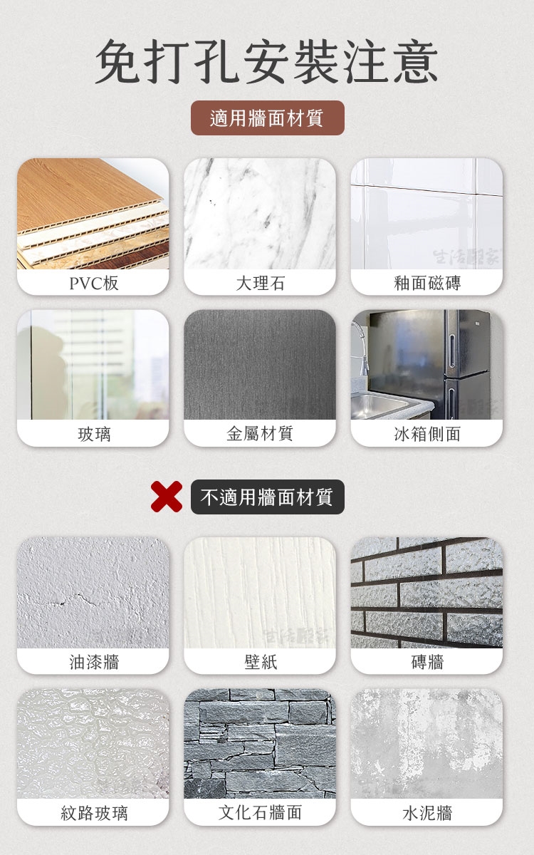 1.本商品僅適用於光滑平整、不掉灰、不掉皮的牆面,如瓷磚、大理石、玻璃、金屬板等。請避開粉刷牆、壁紙、石灰牆等粗糙或不耐重的表面。