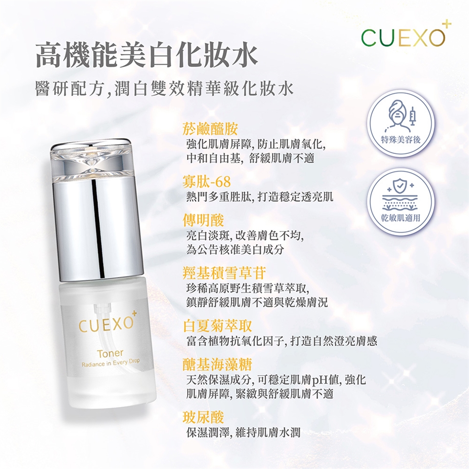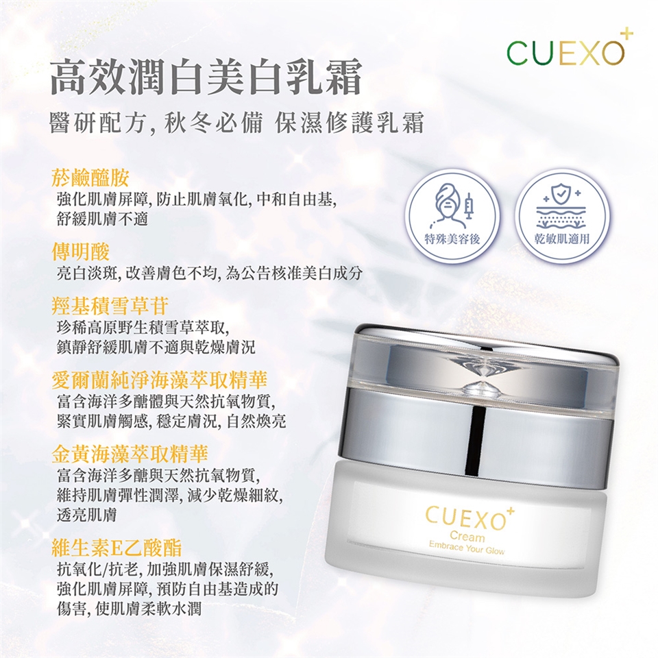 臉部清潔→美白化妝水→CUEXO+植萃外泌精華(日夜皆可使用)→美白乳霜→基礎防曬隔離