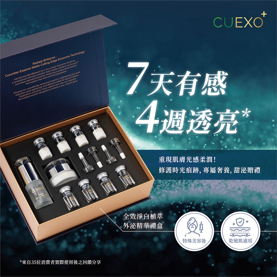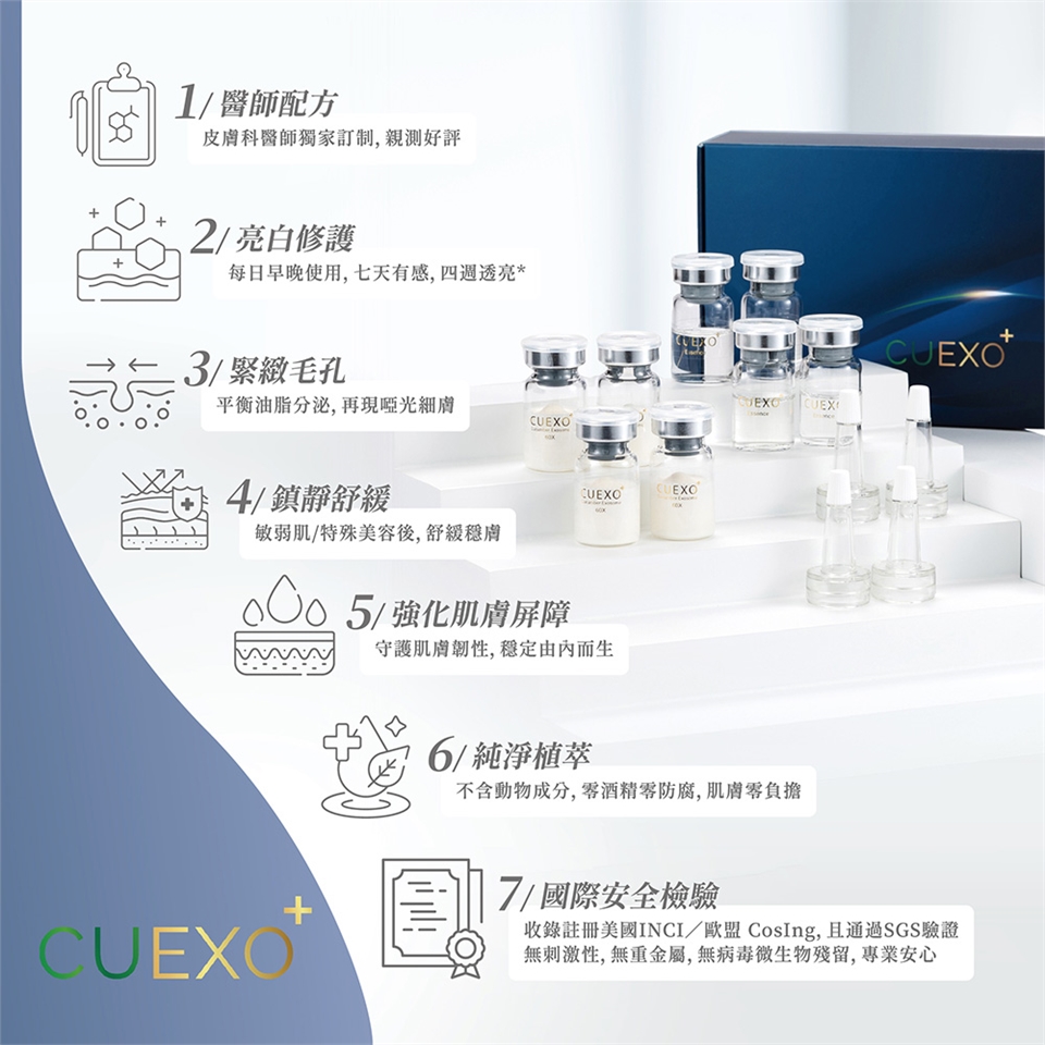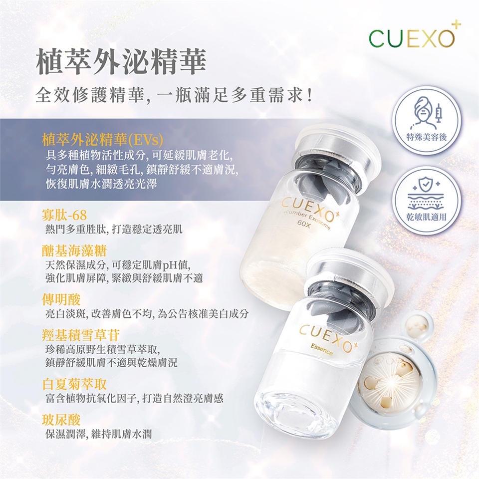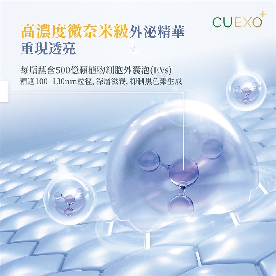 (1) CUEXO+植萃外泌精華為植物細胞外囊泡(涷晶)與晶露混合後的精華液,若呈現微黃至黃褐色屬正常現象,可安心使用。