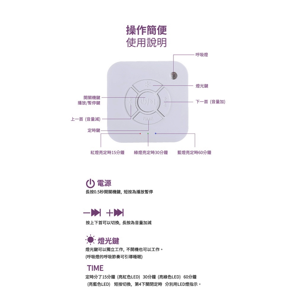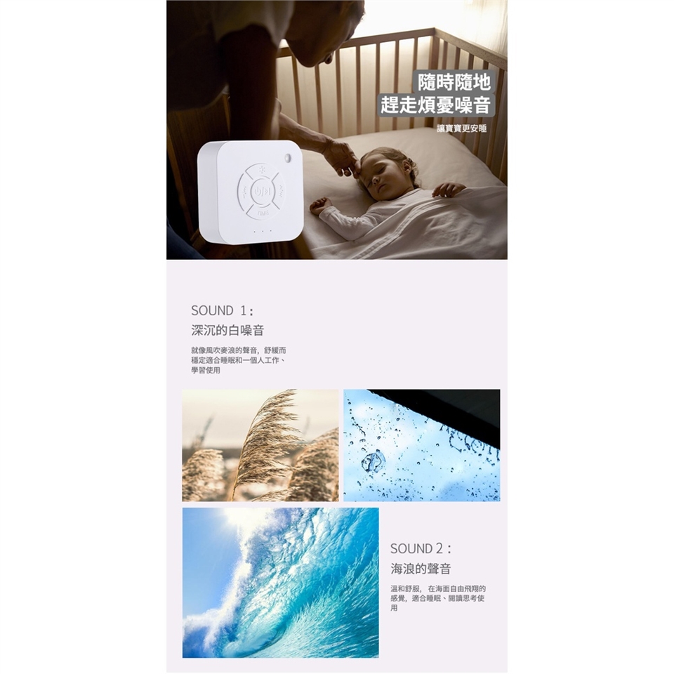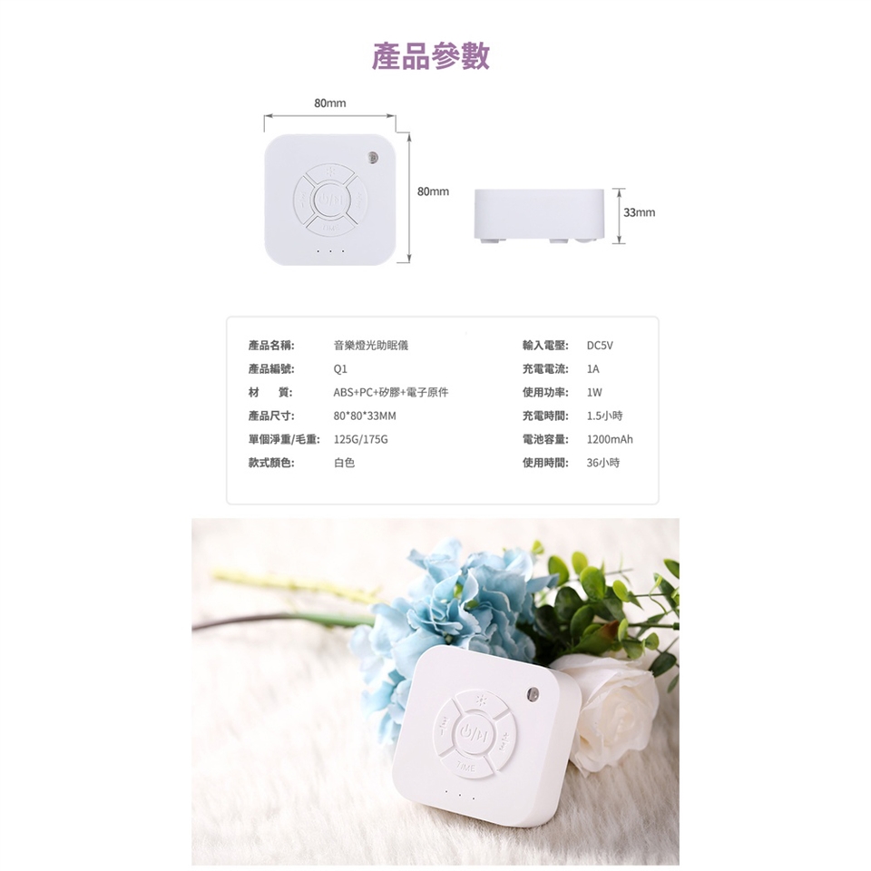 9種經典音樂隨意挑選,3種智能定時設計,貼心呼吸助眠燈,有節奏感的引導睡眠,遮蓋外部環境噪音干擾,集中注意力,工作更有效率,USB快速充電,體積輕巧,配掛繩洞,吊掛起來超省空間,攜帶方便