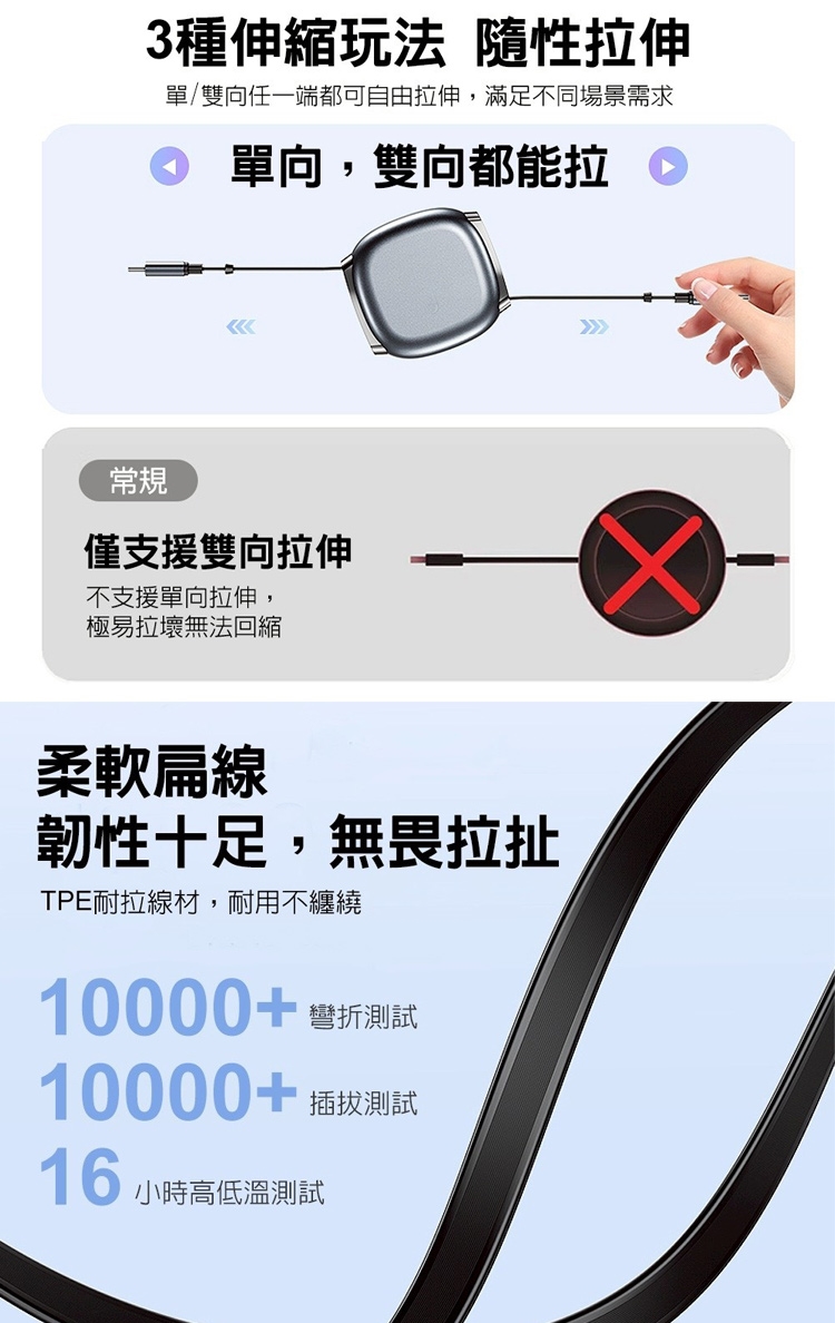 雙向伸縮不卡線:3檔卡點,最長1米,拉了就充