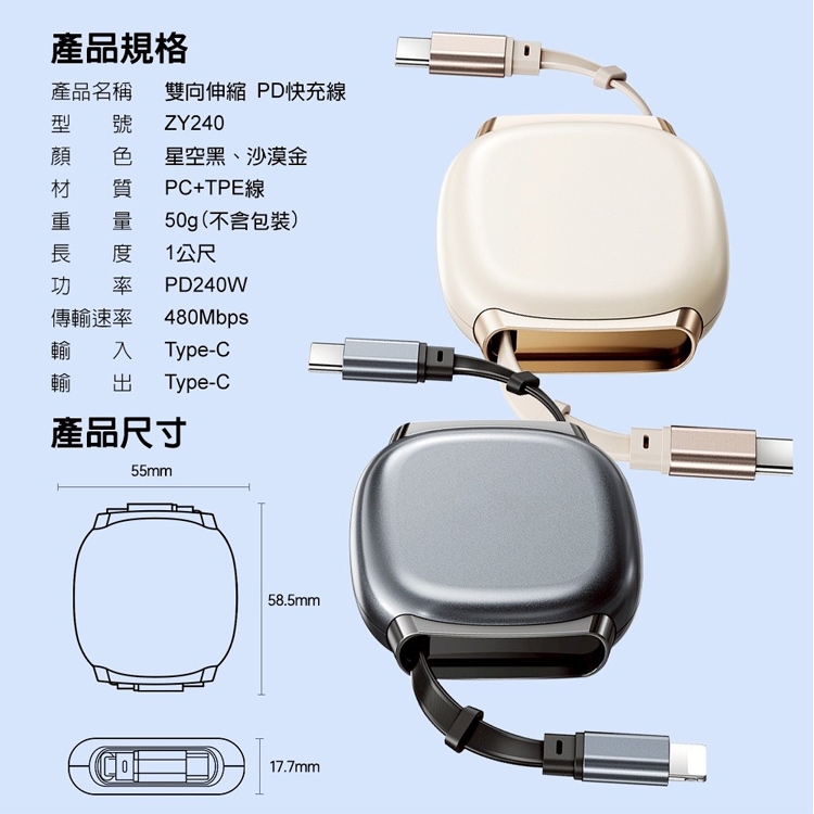 DA 雙向伸縮快充線USB-C to USB-C 240W 磁吸收納 3檔卡點 一拉即用 100公分-2個一組