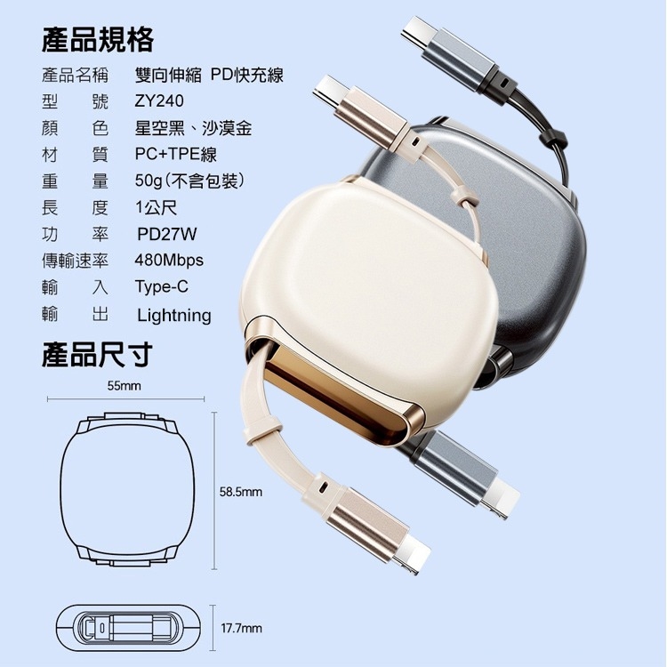 DA 雙向伸縮快充線USB-C to Lightning 27W 磁吸收納 3檔卡點 一拉即用 100公分-2個一組