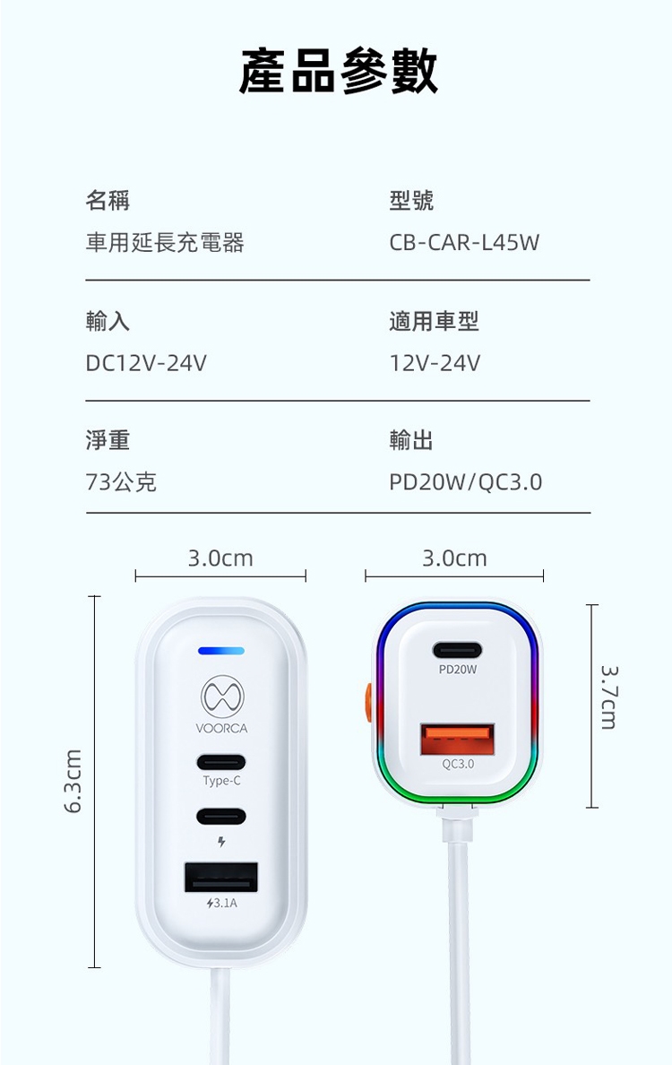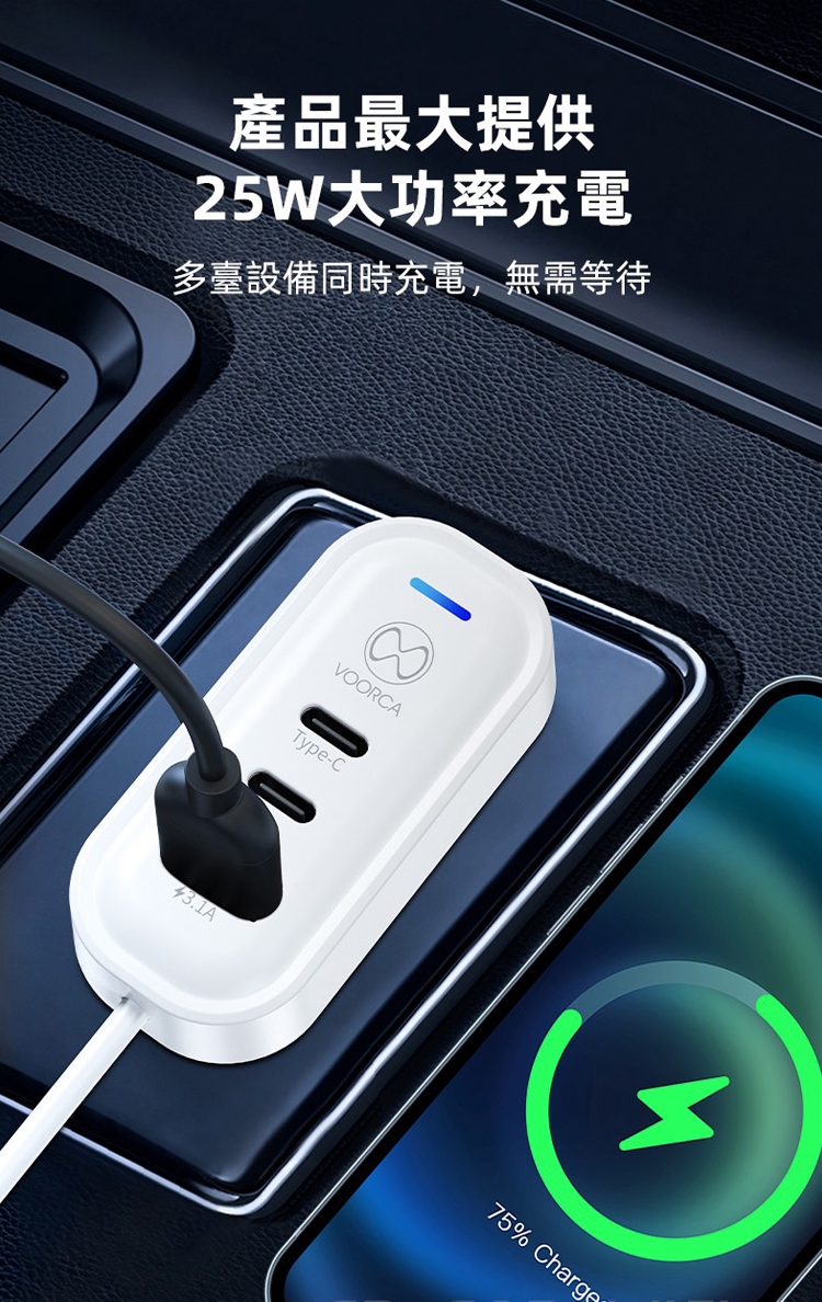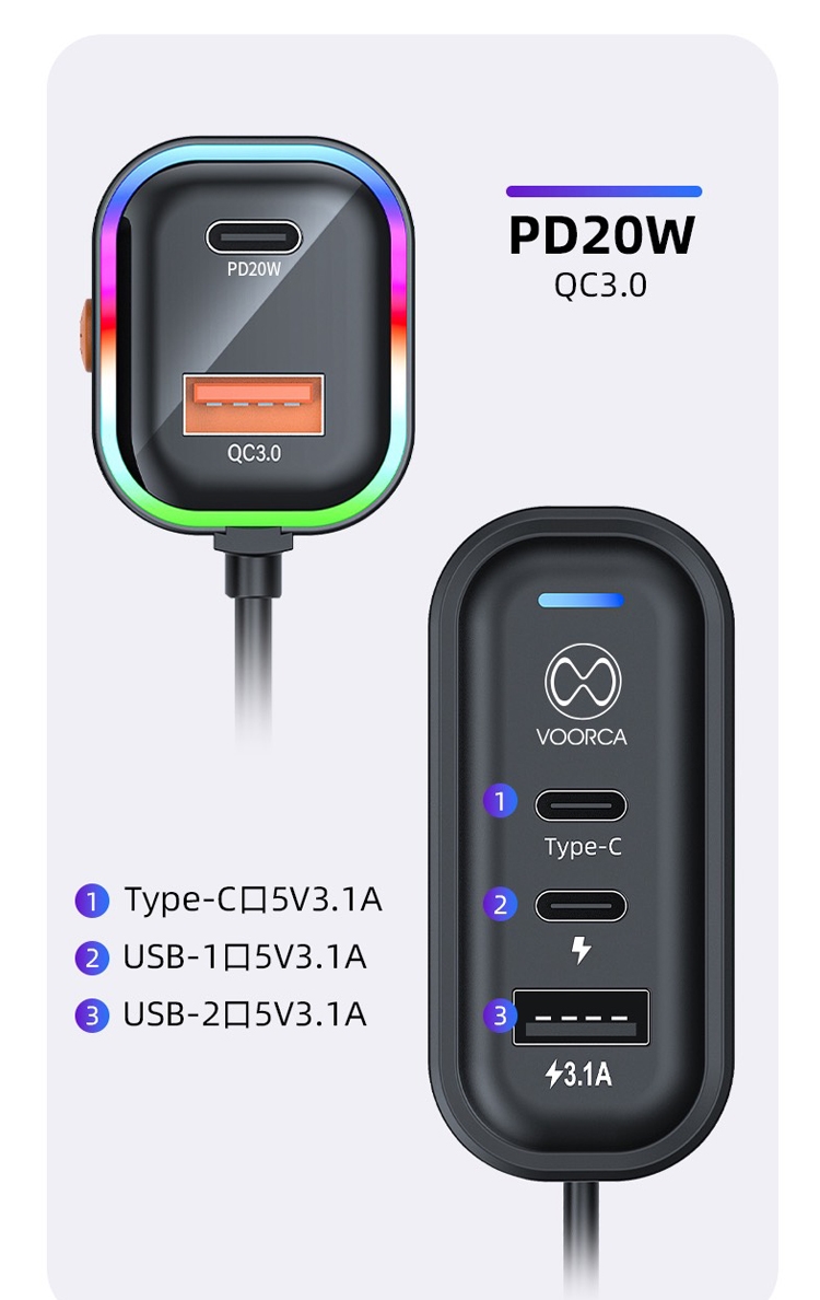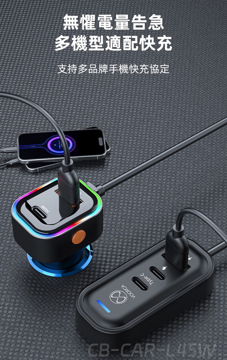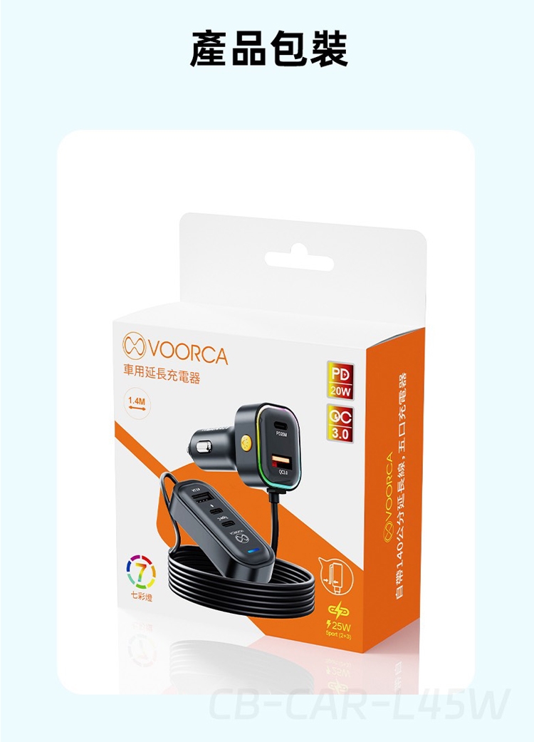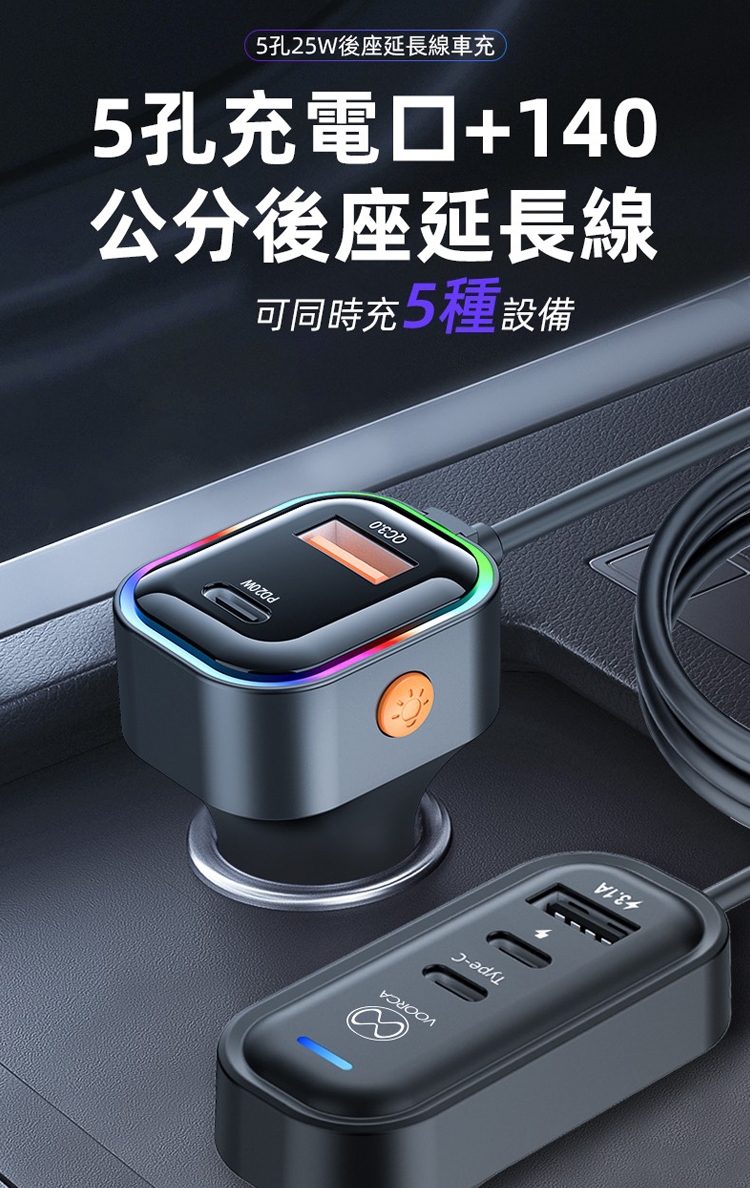 VOORCA K5 CB-CAR-L45W 車用45W快充 Type-C 5孔車充 140公分延長線 PD快充