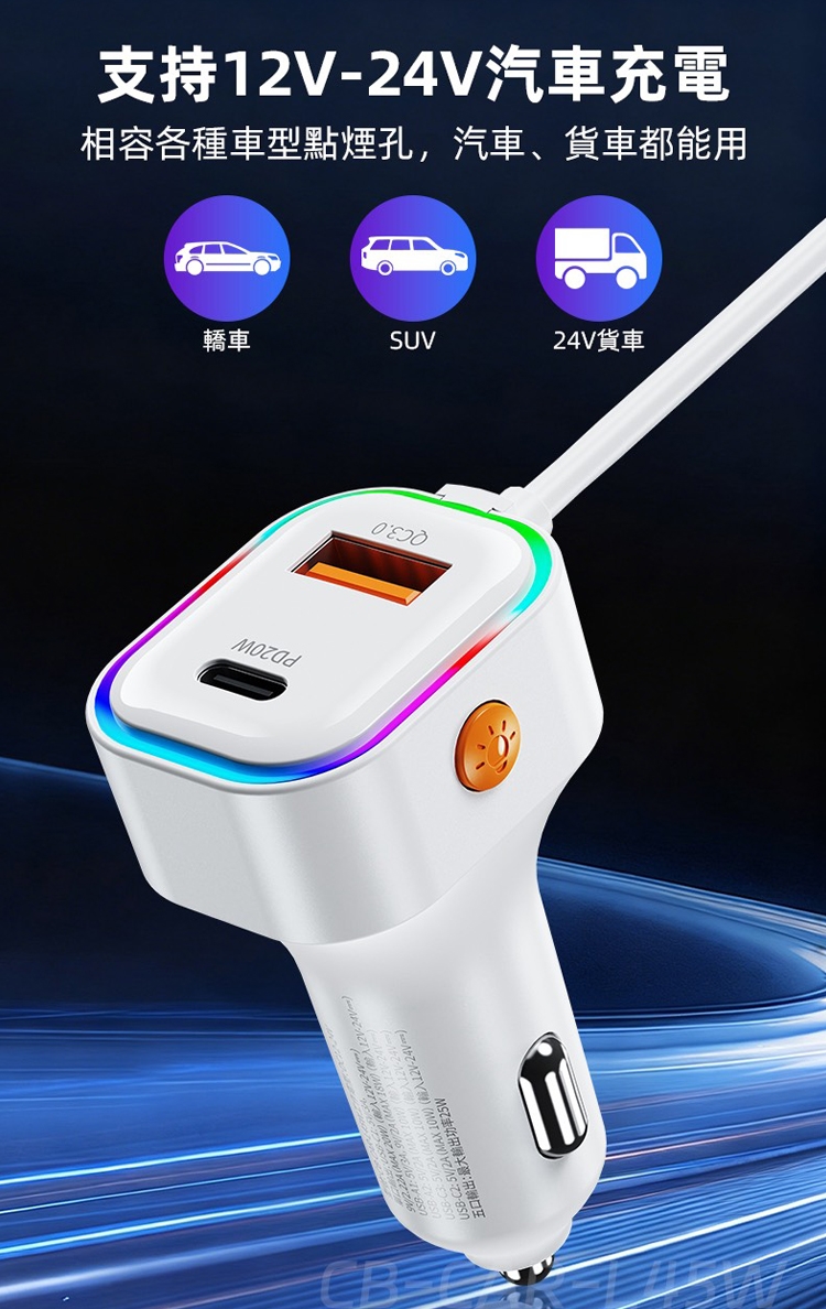 支援12V–24V全車型,還有多色氣氛燈,夜間充電更好找、車內更有感!