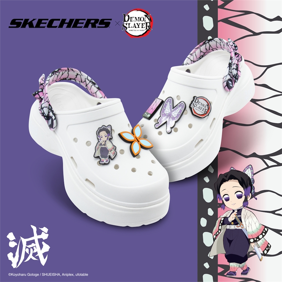 蟲柱-胡蝶忍聯名款,採用 FOAMIES TAI 厚底涼鞋為原型鞋,以樸素潔白的鞋面為基底,鞋扣則是以胡蝶忍人物以及其日輪刀的鐔為搭配,後跟鞋帶採用蝴蝶翅膀的羽織花紋,將角色的靈魂細節融入日常穿搭,展現你的專屬風格。