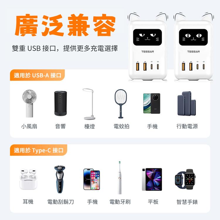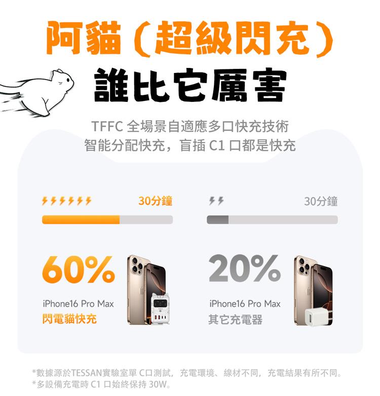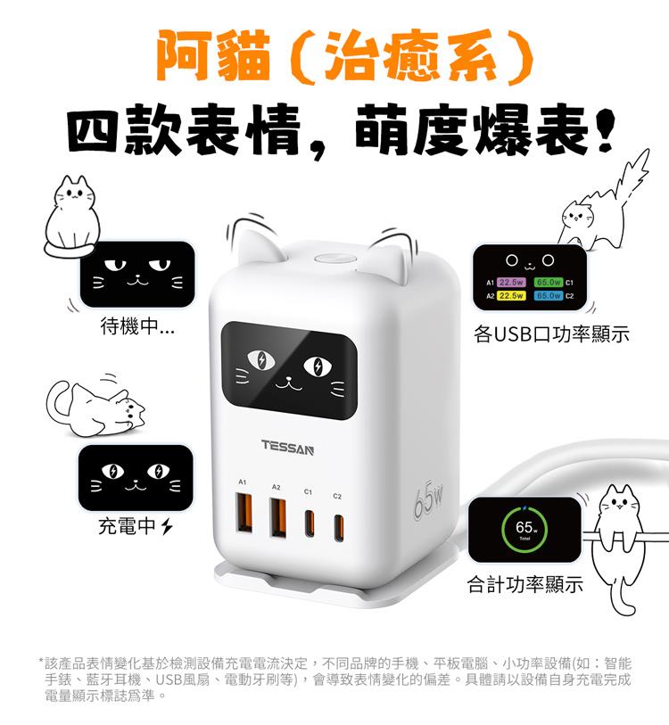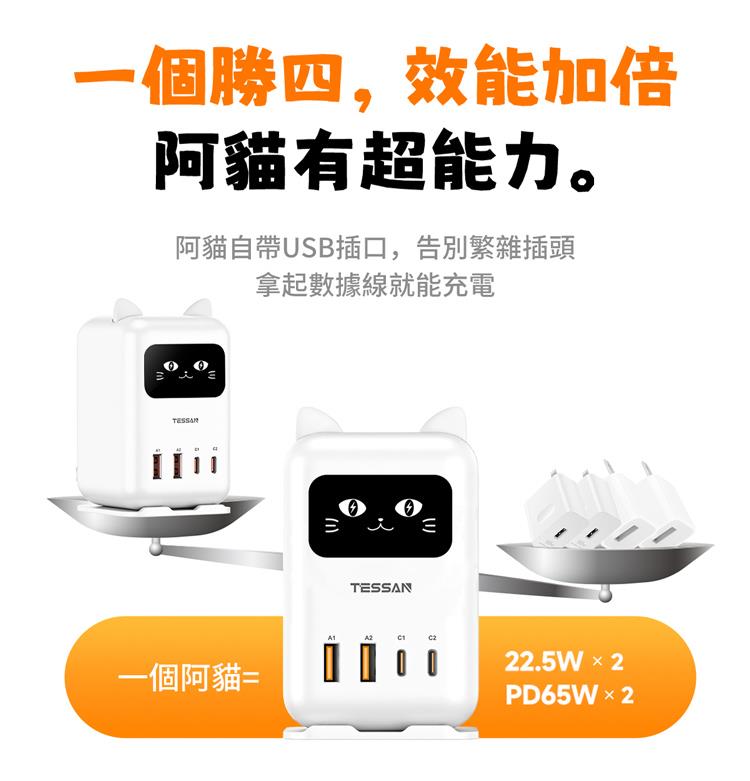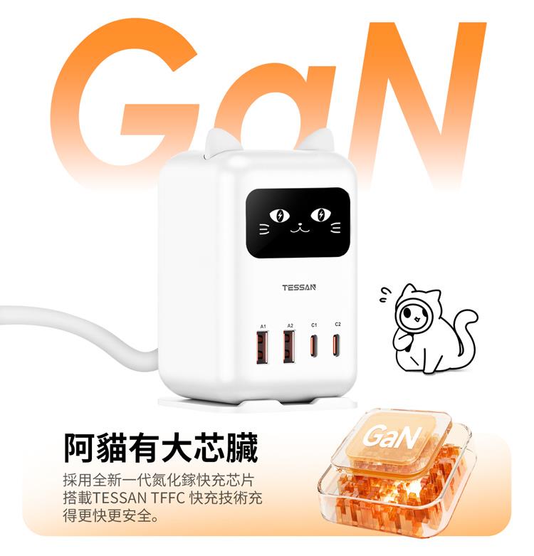 TESSAN 閃電貓65W GaN氮化鎵 快充充電器-1.8米