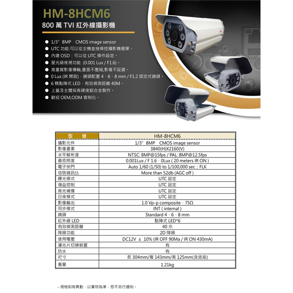● 0 Lux (IR 開啟),鏡頭配置4、6、8 mm / F1.2固定式鏡頭。