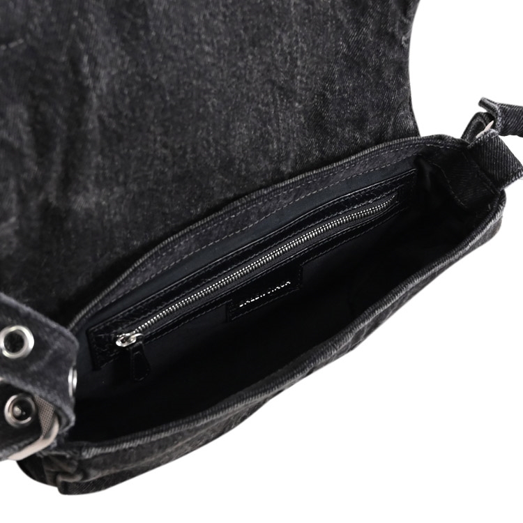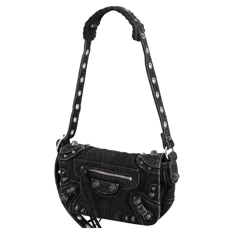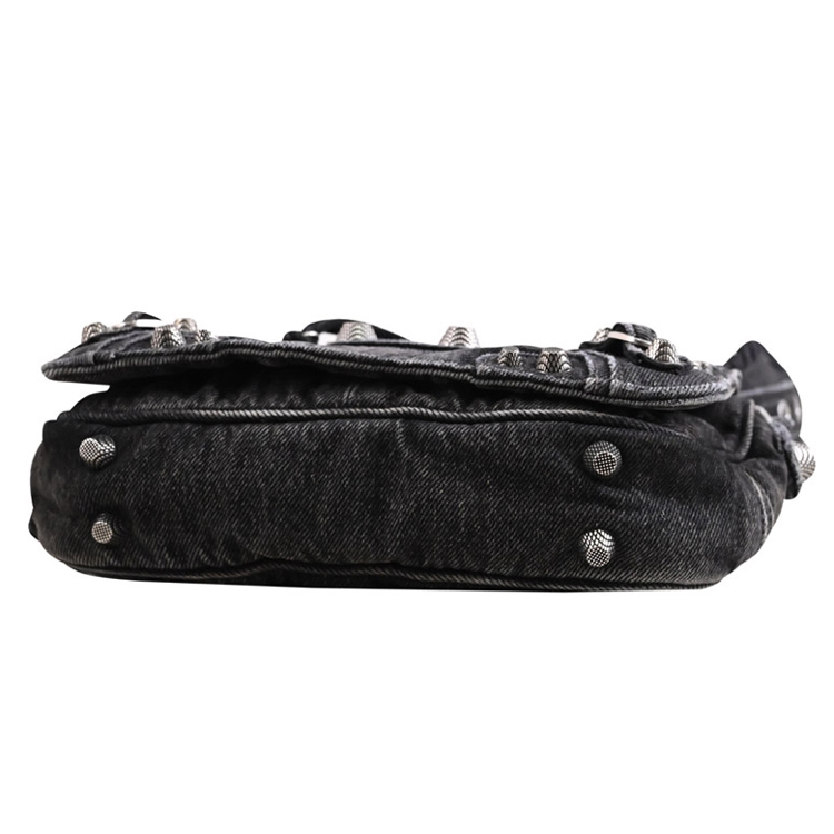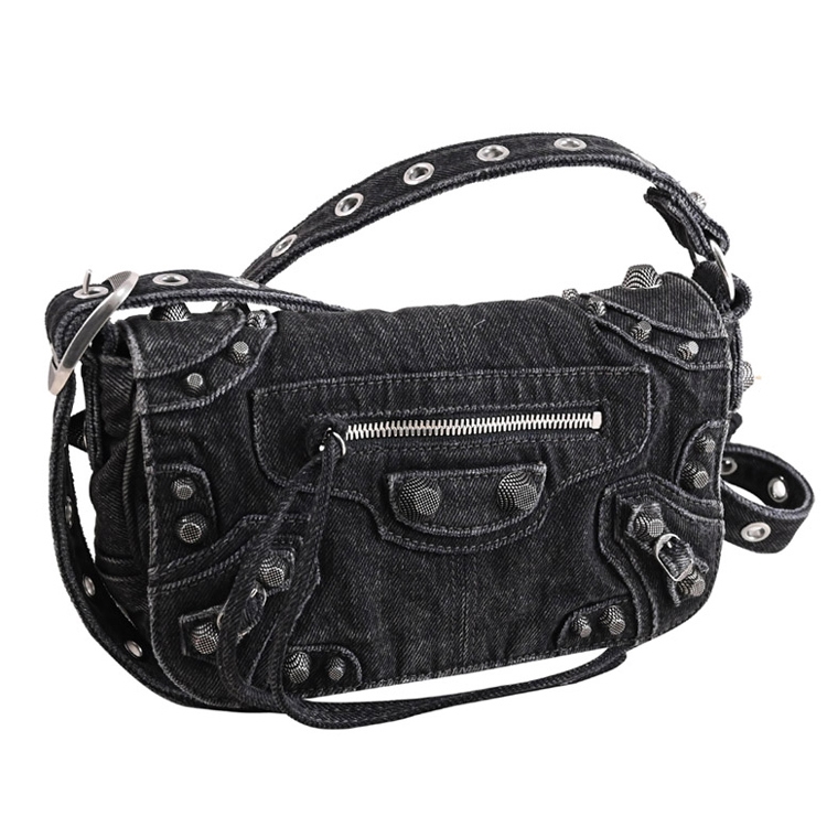 BALENCIAGA 專櫃Le Cagole系列包款,重新詮釋了品牌經典的機車包元素,水洗丹寧布+標誌性的鉚釘裝飾,營造出獨特的複古時尚感,翻蓋開口,內1拉鍊袋+外2拉鍊袋,內可收納手機、長夾及鑰匙等隨身物品,背帶多段可調節,可斜背或側背及肩背攜帶,都會時尚感,搶眼又好搭風格。