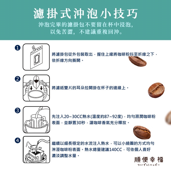 內容量:濾掛咖啡8g±9%/包,容納水量建議250-300ml