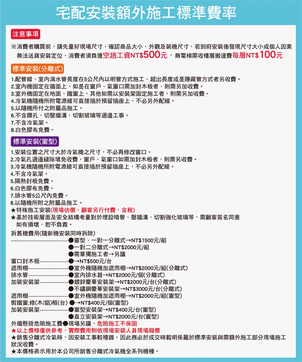 ⚠賣場僅提供冷氣機器販售,未含安裝服務,安裝工程與其相關問題不屬於商品保固範圍。