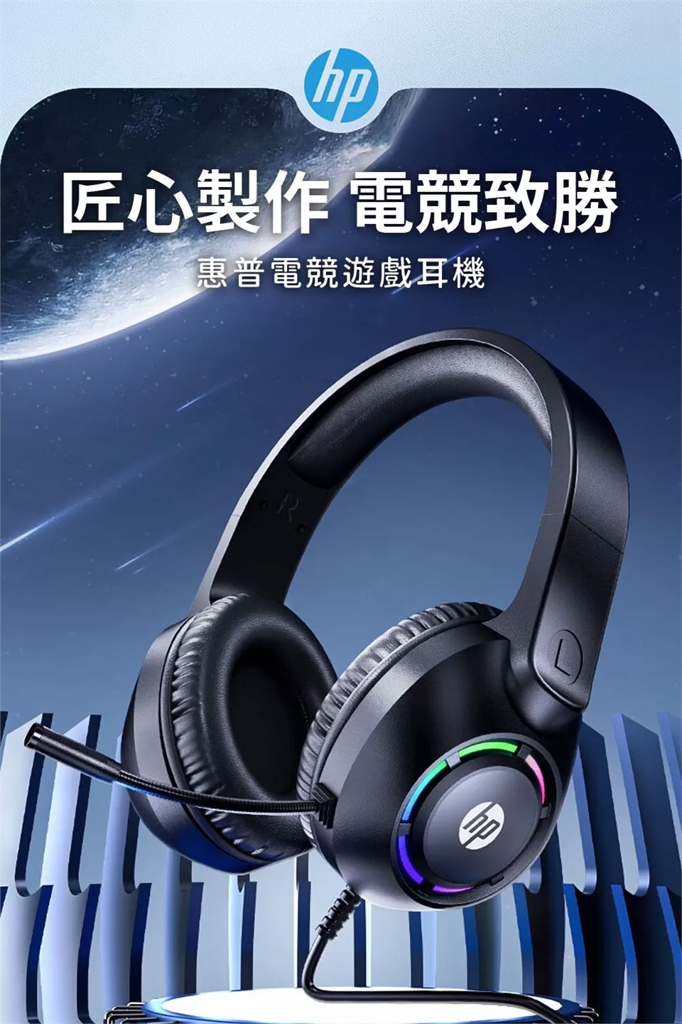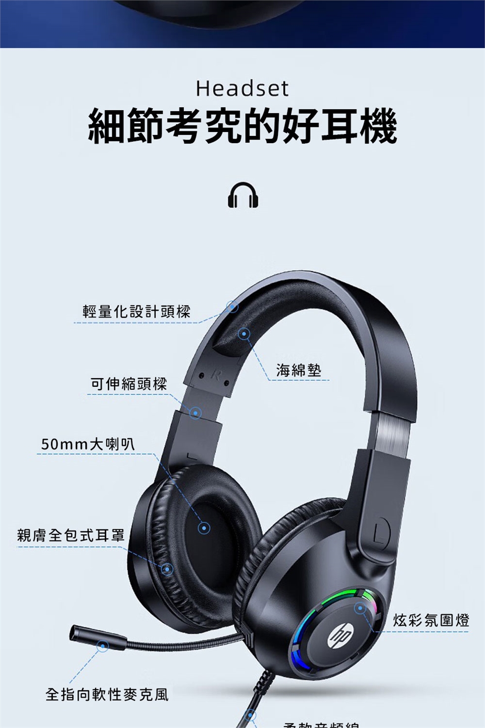 HP 惠普 DHE-8013U 有線頭戴式電競耳機,左側耳機上配有音量與燈效調整,輕鬆調節需要的配置,舒適柔軟記憶海綿墊,柔和光效更有氛圍感。