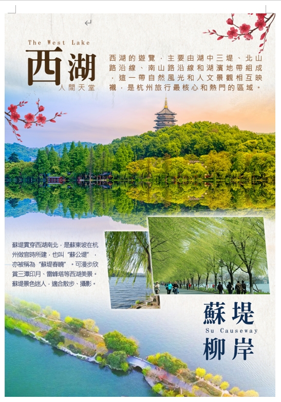 【柳岸蘇堤】是一條貫穿西湖南北風景區的林蔭大堤,位於浙江省杭州市西湖區。蘇堤始建於北宋元祐五年(1090 年),蘇東坡任杭州刺史時疏浚西湖,並利用挖出的淤泥葑草堆築起一條南北走向的堤岸。蘇堤南起南屏山麓,北至棲霞嶺,堤岸兩側柳樹成行,綿延近3公里。蘇堤上有六座橋,可以從不同角度欣賞蘇堤的美景,蘇堤是攝影愛好者的天堂,也是西湖十景之首。堤上有映波、鎖瀾、望山、壓堤、東浦、跨虹六橋,古樸美觀。