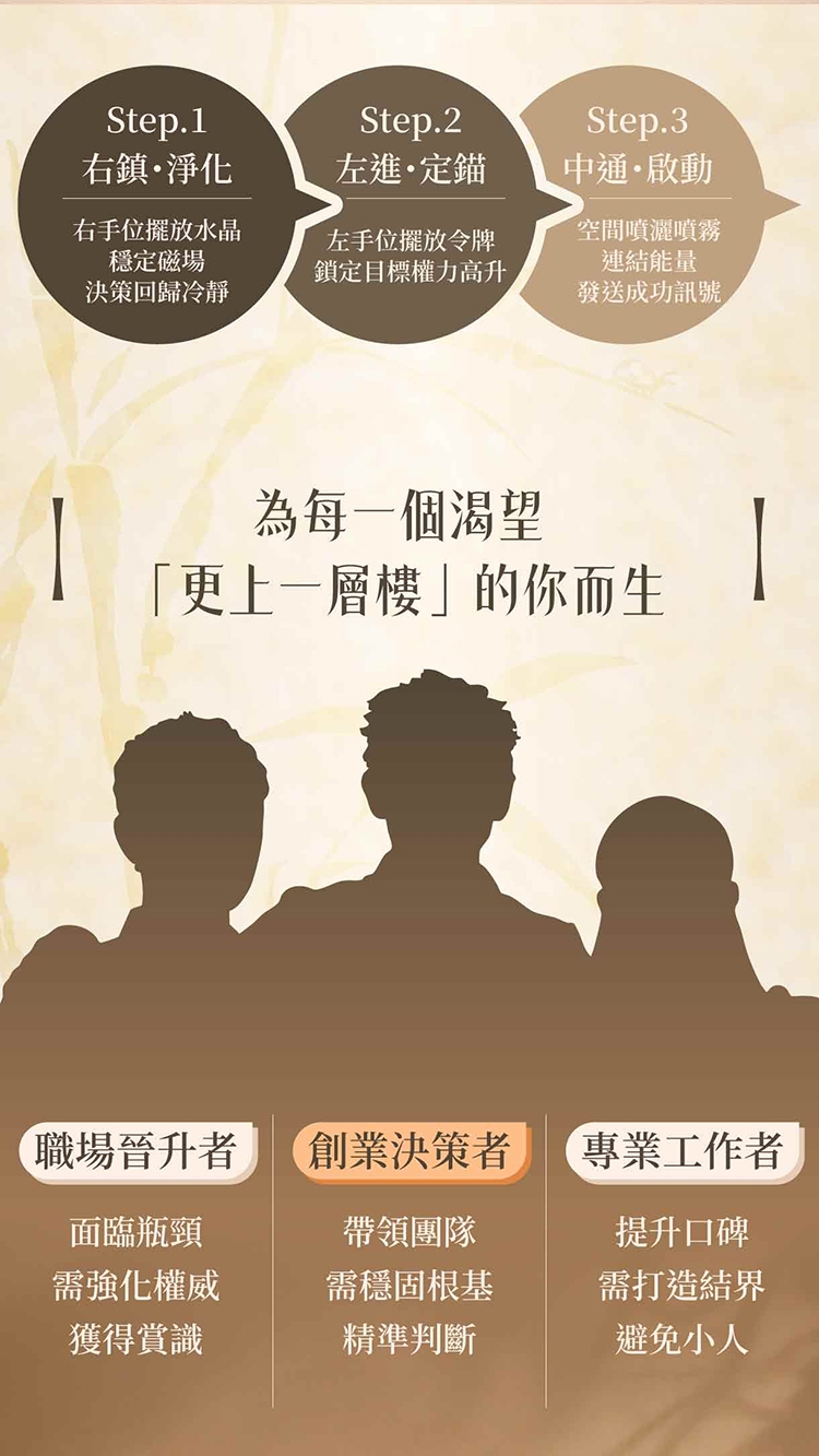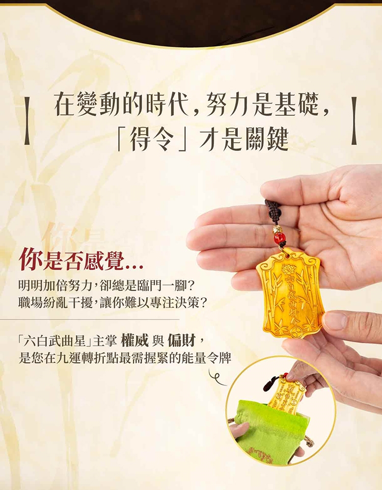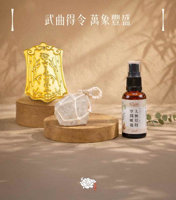 武曲得令能量擺件組:材質:依實際內容配置(樹脂/金屬/能量物件)單品商品材質/成分/規格:六白武曲黃銅牌:黃銅;白水晶結界石:白水晶、麻繩;財源天母心咒袋(綠):布;珍品開運祕法小卡:紙
